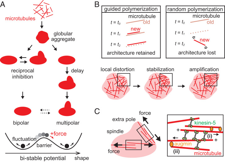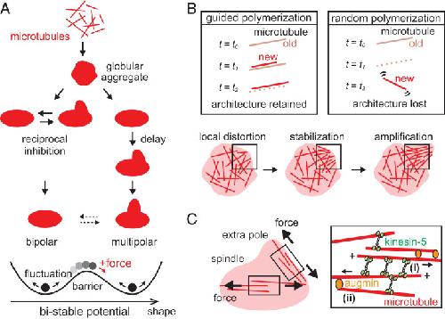 Morphological growth dynamics, mechanical stability, and active microtubule mechanics underlying spindle self-organization.