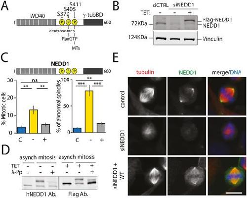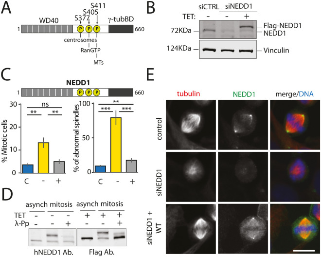 Fig. 1. Inducible expression of Flag-NEDD1 fully rescues spindle assembly and mitotic progression upon NEDD1 silencing in a stable HeLa cell line. (A) Schematic representation of NEDD1 showing the positions of S377, S405 and S411 and the relevance of their phosphorylation for centrosomal, chromosomal and MT-based MT nucleation. The three sites fall into a regulatory domain placed between the N-terminal WD40 domain and a C-terminal γ-tubulin binding domain. (B) Western blots showing NEDD1 protein levels in control (siCTRL) and NEDD1-silenced (siNEDD1) HeLa cells expressing Flag-NEDD1 under tetracycline control (+TET). The anti-human NEDD1 antibody detects both the endogenous and ectopically expressed Flag-NEDD1 proteins. The vinculin band was used as a loading control. (C) Quantifications made on HeLa cells expressing Flag-NEDD1 under tetracycline control showing the percentage of mitotic cells and abnormal spindles in the different experimental conditions. Blue bars represent control siRNA cells not induced with tetracycline (C); yellow bars are cells transfected with NEDD1 siRNA and not induced with tetracycline (–); grey bars correspond to cells transfected with NEDD1 siRNA, treated with tetracycline and expressing Flag-NEDD1 (+). More than 1000 cells were monitored to calculate the percentage of mitotic cells. More than 200 cells were monitored to quantify the spindle phenotypes. The graph represents the average from three independent experiments. Error bars are standard deviation. ns: not significant; **P<0.01; ***P<0,001. (D) Western blot analysis showing endogenous and ectopically expressed Flag-NEDD1 (+TET) in asynchronous and mitotic HeLa cells. Samples were incubated or not with λ-phosphatase (+λ-Pp). The anti-human NEDD1 antibody detects the endogenous NEDD1. The anti-flag antibody detects Flag-NEDD1 WT. (E) Immunofluorescence of control and NEDD1-silenced (siNEDD1) HeLa cells expressing Flag-NEDD1. DNA is in blue, tubulin is in red. The anti-hNEDD1 antibody recognizes the endogenous and ectopically expressed proteins (green). Scale bar: 10 µm.