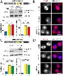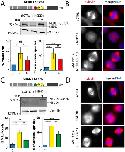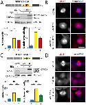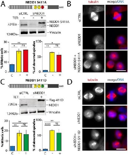 Figure 5. Mitotic phenotypes in NEDD1 silenced HeLa cells upon expression of NEDD1 S411 phospho-variants. (A,C) Upper panels: western blots showing NEDD1 protein levels in control (siCTRL) and NEDD1-silenced (siNEDD1) HeLa cells lines expressing or not Flag-NEDD1 phospho-variants at S411, as indicated (+TET). The anti-human NEDD1 antibody detects both the endogenous and ectopically expressed Flag-NEDD1 proteins. The vinculin band was used as a loading control. Lower panels: quantifications of the percentages of mitotic cells and abnormal spindles in HeLa cells in the different experimental conditions. Blue bars correspond to control cells not induced with tetracycline (C); yellow bars are NEDD1 silenced cells not induced with tetracycline (–); green and red bars correspond to NEDD1 silenced cells induced with tetracycline that express respectively the phospho-null Flag-NEDD1-S411A or phospho-mimetic Flag-NEDD1-S411D variants, as indicated (+). More than 1000 cells were monitored to calculate the percentage of mitotic cells and more than 200 to quantify the spindle phenotypes. The graphs represent the average from two (S411A) and three (S411D) independent experiments. Error bars are standard deviation. ns: not significant; *P<0,02; **P<0,01; ****P<0,0001. (B,D) Immunofluorescence of control (siCTRL) and NEDD1-silenced (siNEDD1) HeLa cells expressing Flag-NEDD1-S411A and Flag-NEDD1-S411D. DNA is in blue and tubulin is in red. Scale bar: 10 µm.