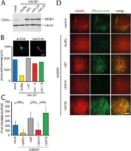 Figure 6. Role of NEDD1 S411 phosphorylation in centrosomal and RanGTP-dependent MT nucleation in Xenopus laevis egg extracts. (A) Western blots of control (mock) and NEDD1-depleted (ΔNEDD1) Xenopus laevis egg extracts supplemented or not (+buffer) with purified recombinant human Flag-NEDD1 proteins, as indicated. The anti-human NEDD1 antibody recognizes both the endogenous and exogenously added NEDD1 proteins. Tubulin was used as a loading control. (B) Activity of NEDD1 phospho-variant at S411 on the MT nucleation activity of centrosomes incubated in egg extracts. Human purified centrosomes were incubated in control (mock) and NEDD1-depleted egg extracts complemented or not with the indicated NEDD1 proteins. The number of centrosomes nucleating MTs after 30 min of incubation was counted in 30 random fields. The graph shows the quantifications from one out of two independent experiments. The images at the top show the microtubules (visualized through rhodamine-tubulin fluorescence) around purified centrosomes representative for active and inactive centrosomes. Scale bar: 10 µm. (C) Quantification of MTs assembled in RanGTP-complemented egg extracts. Control (mock) and NEDD1-depleted egg extracts complemented or not with the different human Flag-NEDD1 proteins (as indicated) were incubated for 20 min at 21°C and loaded into a flow chamber for TIRF imaging. Small amounts of Rhodamine labelled tubulin and GFP-Mal3 were added to respectively label the MTs and their growing plus-ends. The quantifications correspond to the number of MT plus ends in each field of view. Five random fields per condition in three independent experiments were analyzed. Error bars are standard deviations. ***P<0,001 (t-test). (D) Selected images from TIRF imaging of egg extracts in the different experimental conditions described and quantified in (C) Rhodamine tubulin (red) labels the MTs. GFP-Mal3 (green) labels the growing MTs plus-ends. Scale bar: 10 µm.