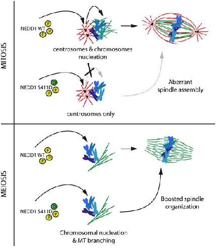 Figure 8. Model: Cdk1 phosphorylation on NEDD1 S411 is a central and critical event for spindle assembly in mitosis and meiosis. A precise regulation of NEDD1 S377, S405 and S411 phospho-events (yellow circles) define the equilibrium between MT nucleation from centrosomes (red) and chromosomes (green). The phospho-variant NEDD1 S411D that mimics a constitutively phosphorylated state (green circle) is detrimental for spindle assembly in HeLa cells but functional in Xenopus laevis egg extract. Upper panel: NEDD1-S411D may be retained at the centrosome impairing its function in the chromosome-dependent MT nucleation pathway and thereby spindle assembly. Lower panel: instead, in egg extracts, it promotes chromosome-dependent MT nucleation and branching and the fast organization of the bipolar spindle.