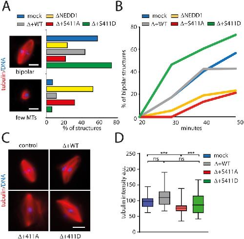 Figure 7. Role of NEDD1 S411 phosphorylation in spindle assembly in Xenopus laevis egg extracts. (A) Quantification of spindle structures assembled around sperm nuclei in cycled control (mock) and NEDD1-depleted egg extracts complemented or not with purified human Flag-NEDD1 variants as indicated. Representative images of a bipolar spindle (bipolar) and an aberrant structure typically found in NEDD1-depleted extract are shown (few MTs). Rhodamine labelled MTs (red) and DNA (blue). Scale bar: 10 μm. The graphs represent the percentage of the two types of structures in the different experimental conditions as indicated. More than 50 spindles were counted for each experimental condition. One representative out of four independent experiments with similar distributions. Scale bars: 10 μm. (B) Time course analysis of spindle assembly in the same experimental conditions as in A. More than 50 spindles were counted for each time point and experimental condition. The graph corresponds to one representative experiment out of three independent experiments. (C) Representative images of spindles assembled in control (mock) and NEDD1-depleted egg extracts complemented or not with purified human Flag-NEDD1 variants, as indicated. Rhodamine labelled MTs (red) and DNA (blue). Scale bar: 10 μm. (D) Box-and-whisker plots showing MT density in bipolar spindles assembled in the same experimental conditions as in C. MT density is expressed as the total tubulin fluorescence intensity normalized for the spindle area. More than 20 spindles were measured for each condition. The graph corresponds to one representative experiment out of three independent experiments. ***P<0,001 (t-test).
