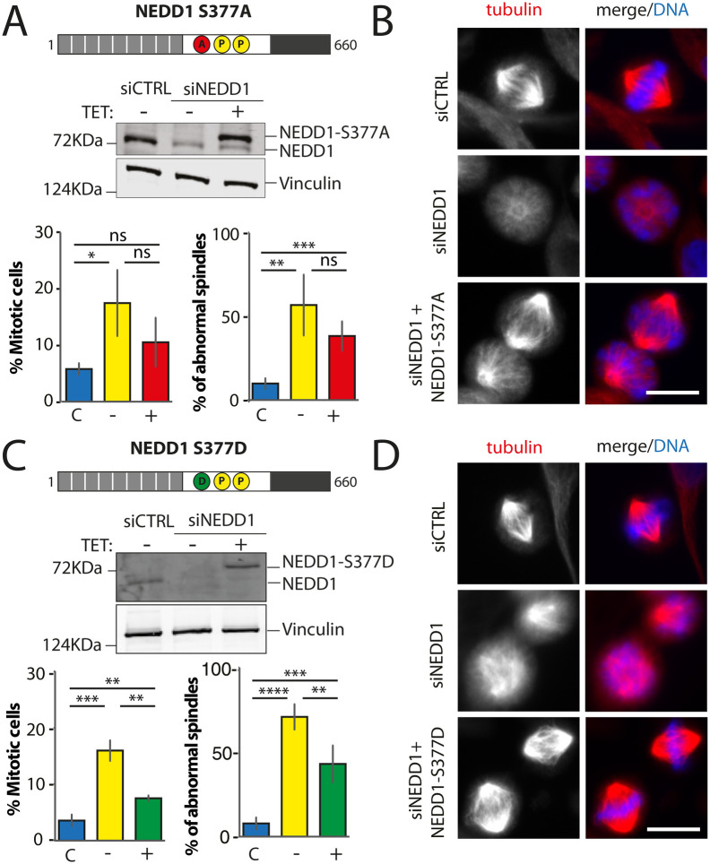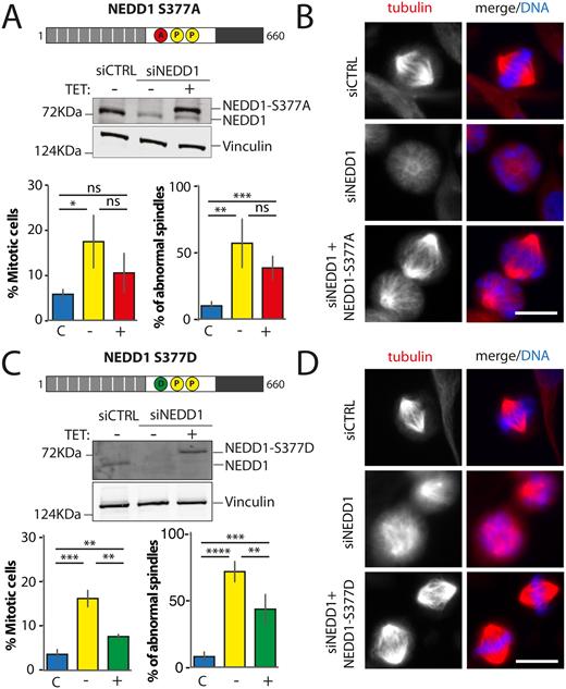 Fig. 3. Mitotic phenotypes in NEDD1 silenced HeLa cells upon expression of NEDD1 S377 phospho-variants. (A,C) Upper panels: western blots showing NEDD1 protein levels in control (siCTRL) and NEDD1-silenced (siNEDD1) HeLa cell lines expressing or not Flag-NEDD1 phospho-variants at S377, as indicated (+TET). The anti-human NEDD1 antibody detects both the endogenous and ectopically expressed Flag-NEDD1 proteins. The vinculin band was used as a loading control. Lower panels: quantifications of the percentages of mitotic cells and abnormal spindles in HeLa cells in the different experimental conditions. Blue bars correspond to control cells not induced with tetracycline (C); yellow bars are NEDD1 silenced cells not induced with tetracycline (–); green and red bars correspond to NEDD1 silenced cells induced with tetracycline that express respectively the phospho-null Flag-NEDD1-S377A or phospho-mimetic Flag-NEDD1-S377D variants, as indicated (+). More than 1000 cells were monitored to calculate the percentage of mitotic cells and more than 200 to quantify the spindle phenotypes. The graphs represent the average from three independent experiments. Error bars are standard deviation. ns: not significant; **P<0,01; ***P<0,001; ****P<0,0001. (B,D) Immunofluorescence of control (siCTRL) and NEDD1-silenced (siNEDD1) HeLa cell lines expressing Flag-NEDD1-S377A or Flag-NEDD1-S377D. DNA is in blue and tubulin is in red. Scale bar: 10 µm.