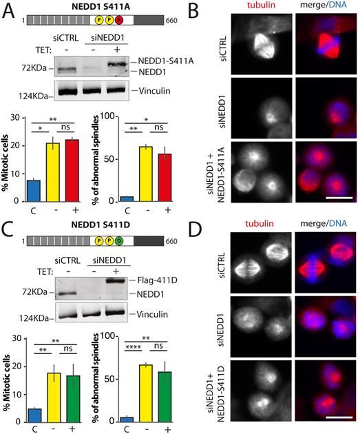 Fig. 5. Mitotic phenotypes in NEDD1 silenced HeLa cells upon expression of NEDD1 S411 phospho-variants. (A,C) Upper panels: western blots showing NEDD1 protein levels in control (siCTRL) and NEDD1-silenced (siNEDD1) HeLa cells lines expressing or not Flag-NEDD1 phospho-variants at S411, as indicated (+TET). The anti-human NEDD1 antibody detects both the endogenous and ectopically expressed Flag-NEDD1 proteins. The vinculin band was used as a loading control. Lower panels: quantifications of the percentages of mitotic cells and abnormal spindles in HeLa cells in the different experimental conditions. Blue bars correspond to control cells not induced with tetracycline (C); yellow bars are NEDD1 silenced cells not induced with tetracycline (–); green and red bars correspond to NEDD1 silenced cells induced with tetracycline that express respectively the phospho-null Flag-NEDD1-S411A or phospho-mimetic Flag-NEDD1-S411D variants, as indicated (+). More than 1000 cells were monitored to calculate the percentage of mitotic cells and more than 200 to quantify the spindle phenotypes. The graphs represent the average from two (S411A) and three (S411D) independent experiments. Error bars are standard deviation. ns: not significant; *P<0,02; **P<0,01; ****P<0,0001. (B,D) Immunofluorescence of control (siCTRL) and NEDD1-silenced (siNEDD1) HeLa cells expressing Flag-NEDD1-S411A and Flag-NEDD1-S411D. DNA is in blue and tubulin is in red. Scale bar: 10 µm.