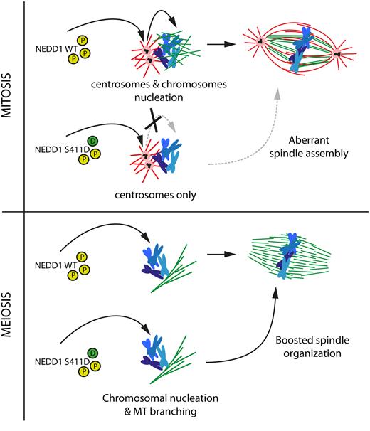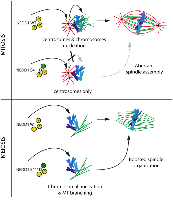 Fig. 8. Model: Cdk1 phosphorylation on NEDD1 S411 is a central and critical event for spindle assembly in mitosis and meiosis. A precise regulation of NEDD1 S377, S405 and S411 phospho-events (yellow circles) define the equilibrium between MT nucleation from centrosomes (red) and chromosomes (green). The phospho-variant NEDD1 S411D that mimics a constitutively phosphorylated state (green circle) is detrimental for spindle assembly in HeLa cells but functional in Xenopus laevis egg extract. Upper panel: NEDD1-S411D may be retained at the centrosome impairing its function in the chromosome-dependent MT nucleation pathway and thereby spindle assembly. Lower panel: instead, in egg extracts, it promotes chromosome-dependent MT nucleation and branching and the fast organization of the bipolar spindle.