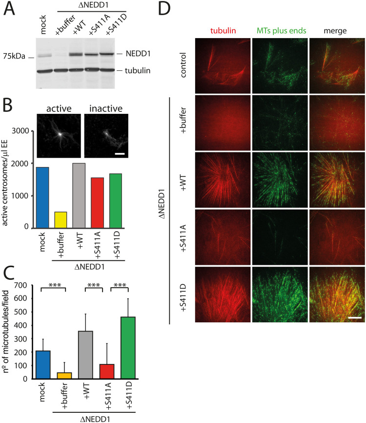 Fig. 6. Role of NEDD1 S411 phosphorylation in centrosomal and RanGTP-dependent MT nucleation in Xenopus laevis egg extracts. (A) Western blots of control (mock) and NEDD1-depleted (ΔNEDD1) Xenopus laevis egg extracts supplemented or not (+buffer) with purified recombinant human Flag-NEDD1 proteins, as indicated. The anti-human NEDD1 antibody recognizes both the endogenous and exogenously added NEDD1 proteins. Tubulin was used as a loading control. (B) Activity of NEDD1 phospho-variant at S411 on the MT nucleation activity of centrosomes incubated in egg extracts. Human purified centrosomes were incubated in control (mock) and NEDD1-depleted egg extracts complemented or not with the indicated NEDD1 proteins. The number of centrosomes nucleating MTs after 30 min of incubation was counted in 30 random fields. The graph shows the quantifications from one out of two independent experiments. The images at the top show the microtubules (visualized through rhodamine-tubulin fluorescence) around purified centrosomes representative for active and inactive centrosomes. Scale bar: 10 µm. (C) Quantification of MTs assembled in RanGTP-complemented egg extracts. Control (mock) and NEDD1-depleted egg extracts complemented or not with the different human Flag-NEDD1 proteins (as indicated) were incubated for 20 min at 21°C and loaded into a flow chamber for TIRF imaging. Small amounts of Rhodamine labelled tubulin and GFP-Mal3 were added to respectively label the MTs and their growing plus-ends. The quantifications correspond to the number of MT plus ends in each field of view. Five random fields per condition in three independent experiments were analyzed. Error bars are standard deviations. ***P<0,001 (t-test). (D) Selected images from TIRF imaging of egg extracts in the different experimental conditions described and quantified in (C) Rhodamine tubulin (red) labels the MTs. GFP-Mal3 (green) labels the growing MTs plus-ends. Scale bar: 10 µm.