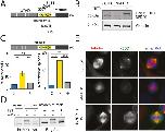 Figure 3. Mitotic phenotypes in NEDD1 silenced HeLa cells upon expression of NEDD1 S377 phospho-variants. (A,C) Upper panels: western blots showing NEDD1 protein levels in control (siCTRL) and NEDD1-silenced (siNEDD1) HeLa cell lines expressing or not Flag-NEDD1 phospho-variants at S377, as indicated (+TET). The anti-human NEDD1 antibody detects both the endogenous and ectopically expressed Flag-NEDD1 proteins. The vinculin band was used as a loading control. Lower panels: quantifications of the percentages of mitotic cells and abnormal spindles in HeLa cells in the different experimental conditions. Blue bars correspond to control cells not induced with tetracycline (C); yellow bars are NEDD1 silenced cells not induced with tetracycline (–); green and red bars correspond to NEDD1 silenced cells induced with tetracycline that express respectively the phospho-null Flag-NEDD1-S377A or phospho-mimetic Flag-NEDD1-S377D variants, as indicated (+). More than 1000 cells were monitored to calculate the percentage of mitotic cells and more than 200 to quantify the spindle phenotypes. The graphs represent the average from three independent experiments. Error bars are standard deviation. ns: not significant; **P<0,01; ***P<0,001; ****P<0,0001. (B,D) Immunofluorescence of control (siCTRL) and NEDD1-silenced (siNEDD1) HeLa cell lines expressing Flag-NEDD1-S377A or Flag-NEDD1-S377D. DNA is in blue and tubulin is in red. Scale bar: 10 µm.