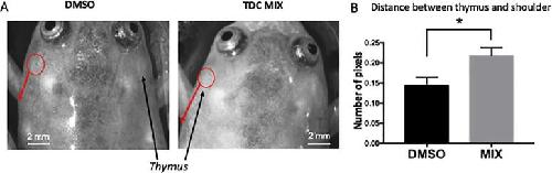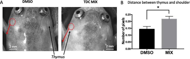 Fig. 1. Quantification of post-metamorphic thymus migration. Stage 60 X. laevis tadpoles were exposed to 1 μg/L of the mixture for 21 days. 21 days after the exposure (roughly 28 days post metamorphosis), froglets were imaged for the relative location of their thymic tissue (A). The distance between the thymus and the posterior end of the arm connecting to the froglet’s shoulder were quantified by ImageJ using number of pixels (B). N = 5 for each treatment and * denotes statistical significance using student’s t-test, error bars denote SEM.