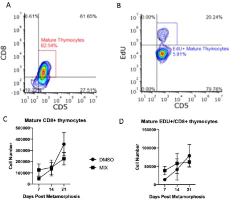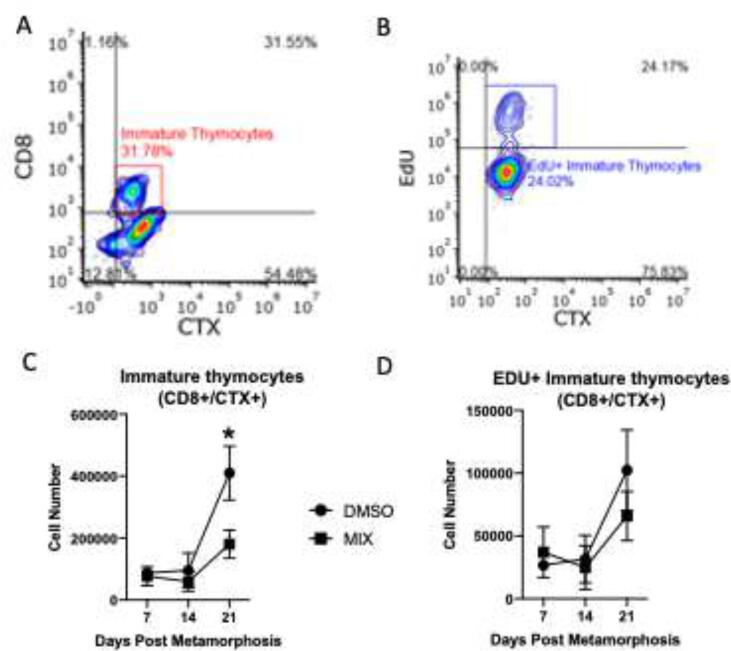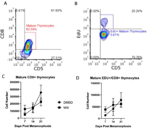 Fig. 3. Quantification of mature medullar thymocytes. Stage 60 X. laevis tadpoles were exposed to 1 μg/L of the mixture for 21 days. At days 7, 14 and 21 post-metamorphosis, froglet thymocytes were evaluated for CD8, CD5 and EdU fluorescence via flow cytometry. Representative gating for the frequency of CD8 + and CD5+ (A) and proliferative EdU + CD8+/CTX + thymocytes (B) are shown. The CD8+/CD5 + thymocytes were then quantified for total cell number (D) and total number of proliferative EdU + CD8+/CD5 + thymocytes (D). N = 4 per group (treatment and timepoints are separate groups), * denotes statistical significance using 2-way ANOVA and Tukey’s post-test.