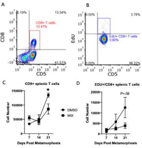 Fig. 4. Quantification of splenic CD8 + T cells. Stage 60 X. laevis tadpoles were exposed to 1 μg/L of the mixture for 21 days. At days 7, 14 and 21 post-metamorphosis, froglet thymocytes were evaluated for CD8, CD5 and EdU fluorescence via flow cytometry. Representative gating for the frequency of CD8 + and CD5+ (A) and proliferative EdU + CD8+/CTX + splenocytes (B) are shown. The CD8+/CD5 + thymocytes were then quantified for total cell number (C) and total number of proliferative EdU + CD8+/CD5 + thymocytes (D). N = 4 per group (treatment and timepoints are separate groups). * Denotes statistical significance using 2-way ANOVA and Tukey’s post-test.