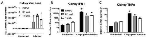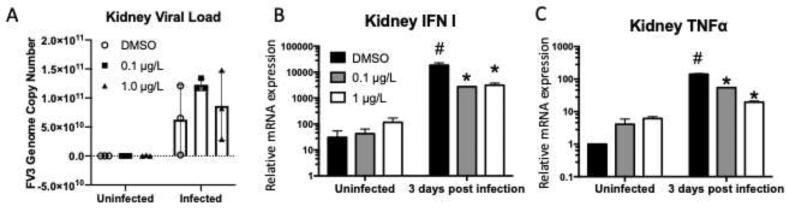 Fig. 5. Anti-viral response against FV3 challenge. Stage 52 tadpoles were exposed to 0.1 and 1 μg/L of the mixture for 3 weeks and then maintained in clean water for 6 months to reach full maturity. Frogs were then infected with FV3, and kidneys were harvested 3 days post infection. (A): Quantification of FV3 genome copy number in uninfected and infected animals. (B) Relative mRNA expression of anti-viral cytokines Type I IFN and TNFα. N = 3 per group. * Denotes statistical significance using one-way ANOVA and Tukey’s post-test among infected groups. # Denotes statistical significance using one-way ANOVA and Tukey’s post-test between uninfected DMSO treated control and DMSO -treated FV3 infected animals.