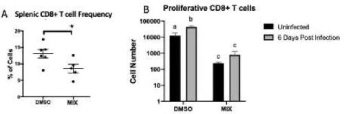 Fig. 6. CD8 + T cell proliferation during FV3 infection. Stage 52 tadpoles were exposed to 1 μg/L of the mixture for 3 weeks and then maintained in clean water for 6 months to reach full maturity. Frogs were then infected with FV3, and splenocytes were harvested and prepared for flow cytometry 6 days post infection. Data presented includes quantification of frequency of CD8 + T cells at steady state (A), and proliferative CD8 + T cells during FV3 infection (B). N = 3 per group, * denotes statistical significance using one-way ANOVA (with logit transformation of % data) and Tukey’s post test for (A) and 2-way ANOVA and Tukey’s post-test for (B). Statistical significance in B is denoted by different lowercase letters, where means that differ significantly have different letters from one another, while means that do not significantly differ have the same letter.