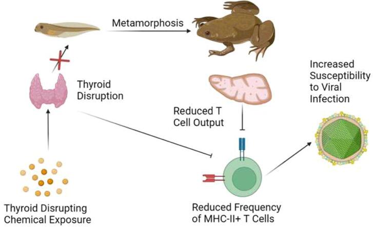 While there is some evidence to suggest that disruption of the thyroid hormone (TH)-axis during perinatal development may weaken T cell immunity later in life, data are currently lacking on whether environmentally relevant thyroid disrupting chemicals (TDCs) can induce similar outcomes. To fill this gap in knowledge, X. laevis tadpoles were exposed to an environmentally relevant mixture of TDCs, either during early tadpole development, or immediately before and during metamorphosis, to assess T cell differentiation and anti-viral immune response against FV3 infection after metamorphosis. Extending our previous study showing a delay in metamorphosis completion, here we report that TDC exposure prior to metamorphosis reduced the frequency of surface MHC-II + splenic lymphocytes and weakened some aspects of the anti-viral immune response. TDC exposure during metamorphosis slowed post-metamorphic migration of the thymus reduced the renewal of cortical thymocytes and splenic CD8 + T cells. The results indicate that TDC exposure during perinatal development may perturb the formation of T cell immunity later in life.