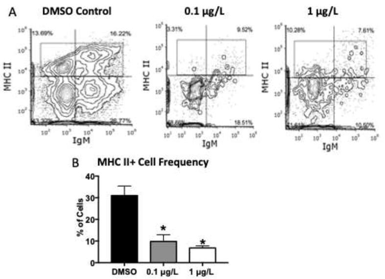 Fig. 7. Quantification of MHC-II + splenic lymphocytes. Stage 52 tadpoles were exposed to 0.1 and 1 μg/L of the mixture for 3 weeks and then maintained in clean water for 6 months to reach full maturity. Splenocytes were then prepared for flow cytometry and gated lymphocytes evaluated for expression of MHC-II and IgM. Representative gating is displayed for each group (A), with quantification of the frequency of total MHCII + lymphocytes (B). N = 3 per group, * denotes statistical significance using one-way ANOVA (with logit transformation of % data) and Tukey’s post-test.
