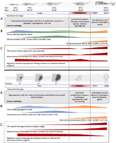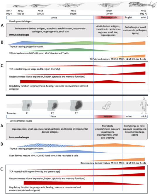 Mycobacterial infections represent major concerns for aquatic and terrestrial vertebrates including humans. Although our current knowledge is mostly restricted to Mycobacterium tuberculosis and mammalian host interactions, increasing evidence suggests common features in endo- and ectothermic animals infected with non-tuberculous mycobacteria (NTMs) like those described for M. tuberculosis. Importantly, most of the pathogenic and non-pathogenic NTMs detected in amphibians from wild, farmed, and research facilities represent, in addition to the potential economic loss, a rising concern for human health. Upon mycobacterial infection in mammals, the protective immune responses involving the innate and adaptive immune systems are highly complex and therefore not fully understood. This complexity results from the versatility and resilience of mycobacteria to hostile conditions as well as from the immune cell heterogeneity arising from the distinct developmental origins according with the concept of layered immunity. Similar to the differing responses of neonates versus adults during tuberculosis development, the pathogenesis and inflammatory responses are stage-specific in Xenopus laevis during infection by the NTM M. marinum. That is, both in human fetal and neonatal development and in tadpole development, responses are characterized by hypo-responsiveness and a lower capacity to contain mycobacterial infections. Similar to a mammalian fetus and neonates, T cells and myeloid cells in Xenopus tadpoles and axolotls are different from the adult immune cells. Fetal and amphibian larval T cells, which are characterized by a lower T cell receptor (TCR) repertoire diversity, are biased toward regulatory function, and they have distinct progenitor origins from those of the adult immune cells. Some early developing T cells and likely macrophage subpopulations are conserved in adult anurans and mammals, and therefore, they likely play an important role in the host-pathogen interactions from early stages of development to adulthood. Thus, we propose the use of developing amphibians, which have the advantage of being free-living early in their development, as an alternative and complementary model to study the role of immune cell heterogeneity in host-mycobacteria interactions.
