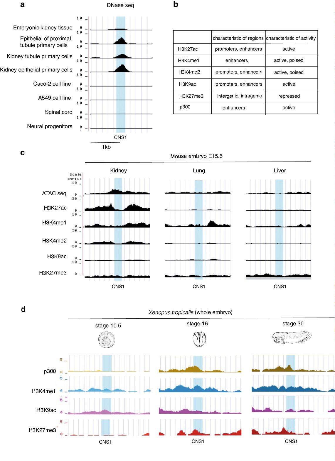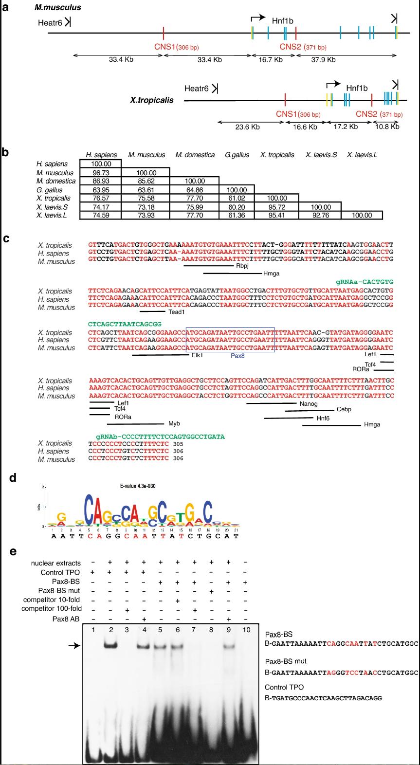 Xenopus provides a simple and efficient model system to study nephrogenesis and explore the mechanisms causing renal developmental defects in human. Hnf1b (hepatocyte nuclear factor 1 homeobox b), a gene whose mutations are the most commonly identified genetic cause of developmental kidney disease, is required for the acquisition of a proximo-intermediate nephron segment in Xenopus as well as in mouse. Genetic networks involved in Hnf1b expression during kidney development remain poorly understood. We decided to explore the transcriptional regulation of Hnf1b in the developing Xenopus pronephros and mammalian renal cells. Using phylogenetic footprinting, we identified an evolutionary conserved sequence (CNS1) located several kilobases (kb) upstream the Hnf1b transcription start and harboring epigenomic marks characteristics of a distal enhancer in embryonic and adult renal cells in mammals. By means of functional expression assays in Xenopus and mammalian renal cell lines we showed that CNS1 displays enhancer activity in renal tissue. Using CRISPR/cas9 editing in Xenopus tropicalis, we demonstrated the in vivo functional relevance of CNS1 in driving hnf1b expression in the pronephros. We further showed the importance of Pax8-CNS1 interaction for CNS1 enhancer activity allowing us to conclude that Hnf1b is a direct target of Pax8. Our work identified for the first time a Hnf1b renal specific enhancer and may open important perspectives into the diagnosis for congenital kidney anomalies in human, as well as modeling HNF1B-related diseases.