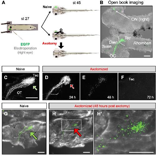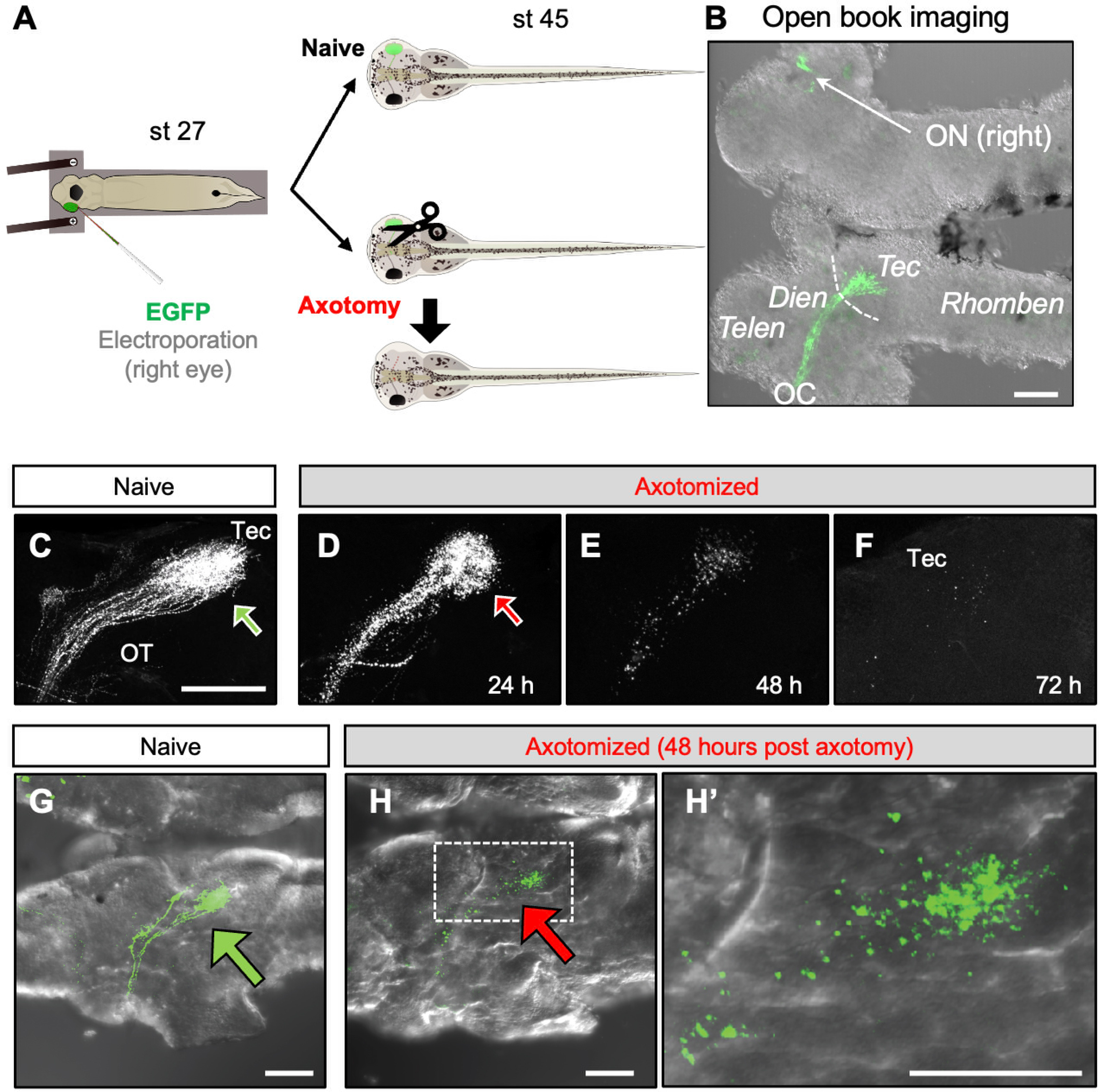 (A) Strategy to visualize Wallerian degeneration of retinal axons. st, stage. (B) Open book imaging of electroporated, fully mature retinal axons. Telen, telencephalon; Dien, diencephalon; Tec, optic tectum; Rhomben, rhombencephalon; ON, optic nerve; OC, optic chiasm. Scale bar = 100 µm. (C-F) Time-course of Wallerian degeneration of retinal axons in vivo. Green and red arrows indicate healthy and degenerating axons, respectively. OT, optic tract. Scale bar = 100 µm. (G and H) Retinal axon before (G) and 48 h after axotomy (H and H'). Green and red arrows indicate healthy and degenerating axons, respectively. Note the beaded morphology of degenerating axons. Scale bars = 100 µm.