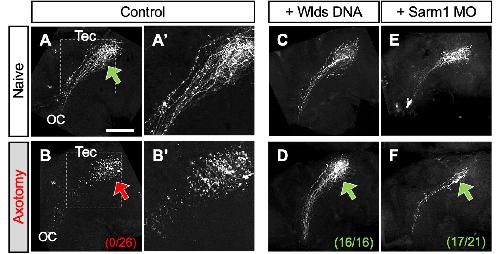 , except that Wlds-encoding plasmid or Sarm1 translation-blocking antisense morpholino (MO) oligonucleotide was co-electroporated with mCherry tracer. (A and B) Control axons without gene alteration. Axotomy induces near-synchronous degeneration of distal axons (red arrow) in all animals tested (0/26). A' and B' are enlarged image of the boxed area in A and B, respectively. Red and green arrows indicate degenerating and healthy axons, respectively. OC, optic chiasm; Tec, optic tectum. (C and D) Wlds protects severed axons from degeneration in all animals tested (green arrow, 16/16). P = 6.0 × 10–12, Fisher’s exact test versus control. (E and F) Sarm1 MO protects severed axons in 81% of animals tested (green arrow, 17/21). P = 2.2 × 10–9, Fisher’s exact test versus control. Scale bar = 100 µm.