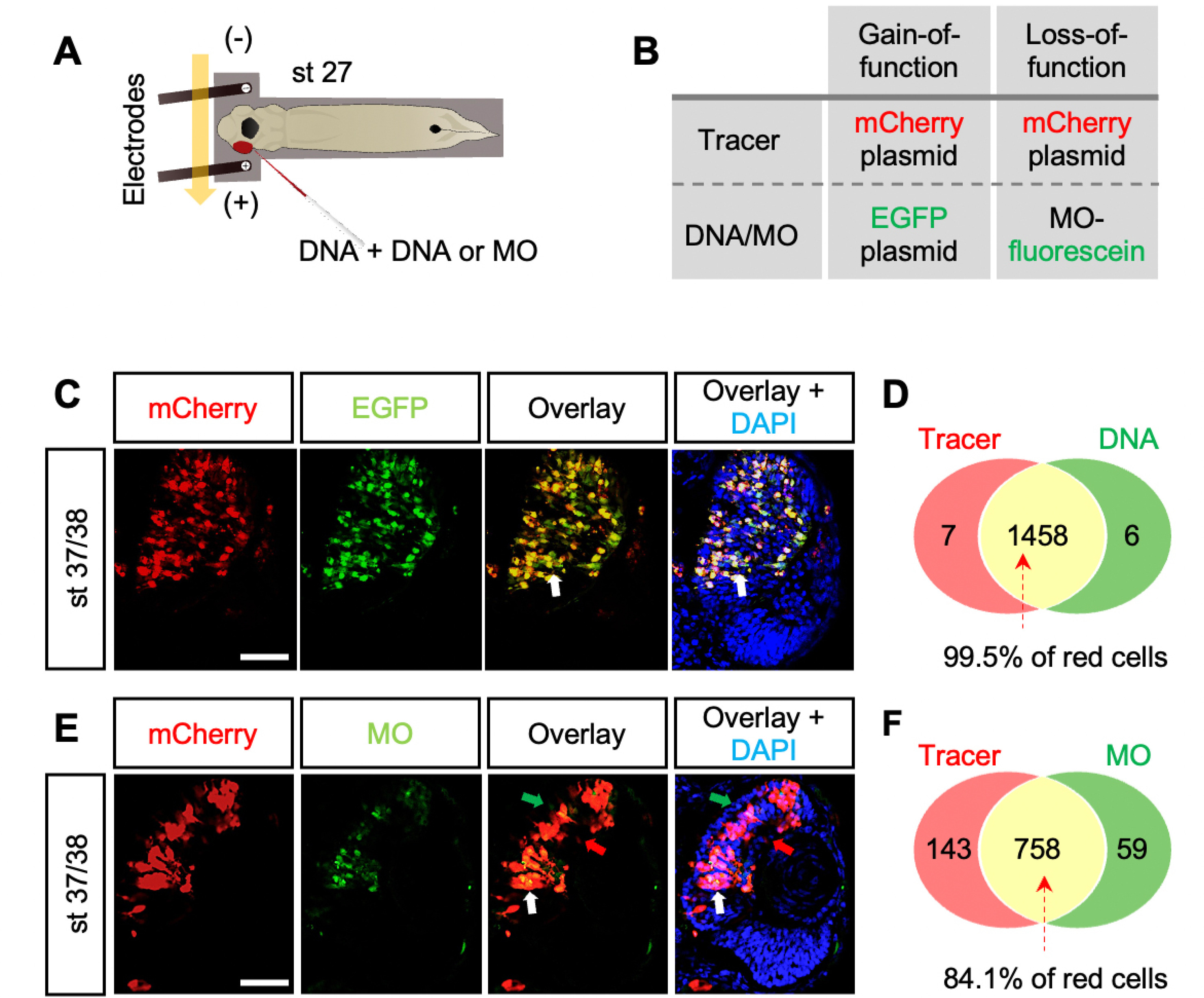 (A) mCherry DNA (axon tracer) was mixed with another DNA (EGFP) or fluorescein-tagged morpholino (MO) oligonucleotides, and electroporated into the right retinal primordium. st, stage. (B) Modeling of gain- or loss-of-function by co-electroporation of DNA or MO with a tracer. (C and D) Coronal section (C) of the retina after DNA-DNA co-electroporation and cell counting (D). Scale bar = 50 µm. (E and F) Coronal section (E) of the retina after DNA-MO co-electroporation and cell counting (F). Scale bar = 50 µm. White arrows, overlay; Green arrows, fluorescein-tagged antisense morpholino (MO); Red arrows, mCherry.