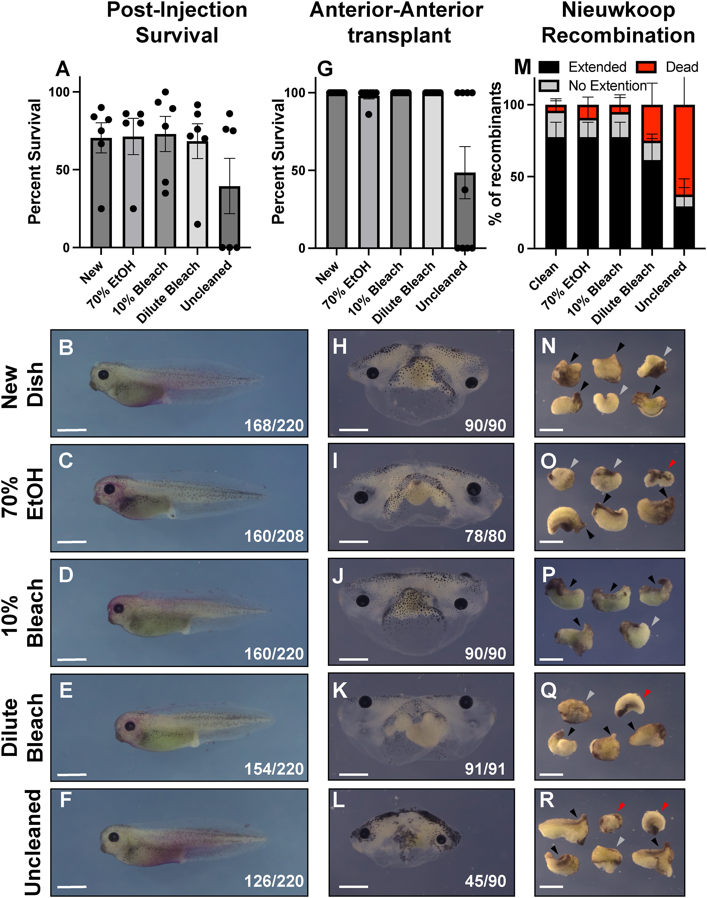 Fig. 3. Post-manipulation culture of embryos in cleaned and reused culture dishes. A. Plot of average post-injection survival in dishes subjected to the indicated treatments. B–F. Representative embryos injected with 200ρg mCherry and LacZ then stained for β-gal (pink color). G. Plot of average anterior-anterior survival rates in dishes subjected to the indicated treatments. H-L. Representative images of embryos after joining anteriors and cultured until stage 45. M. Plot of average Nieuwkoop recombinants across four independent experiments that either extended (black bars), were alive but not extended (gray bars), or died (red bars) in dishes subjected to the indicated treatments. N-R. Results of one Nieuwkoop recombinant experiment with the highest survival across all treatments. Black arrows indicate regions of extension. Gray arrows show living recombinants that didn't extend. Red arrows indicate disintegrating recombinants. B,H,N. Embryos cultured in new dishes. C,I,O. Embryos cultured in dishes cleaned in 70% EtOH. D,J,P. Embryos cultured in dishes cleaned with 10% bleach. E,K,Q. Embryos cultured in dishes cleaned with dilute bleach. F,L,R. Embryos cultured in uncleaned dishes. Error bars show ±S.E.M. Data points show individual replicates. All scale bars: 1000 μm. Anteriors to the left and dorsal to the top in B–F and H-L. Numbers indicate prevalence of the observed phenotype.