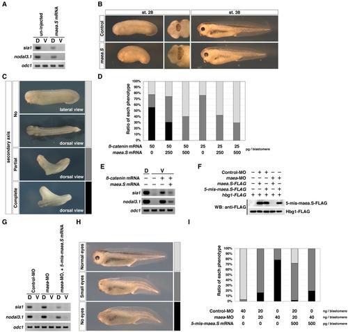 Figure 3. Effects of ß-catenin on head and secondary axis formation by maea.S. (a) RT-PCR analysis of the dorsal or ventral sectors from embryos (st. 10) injected with maea.S mRNA. D, dorsal sectors. V, ventral sectors. (b) Phenotypes of embryos when injected with maea.S mRNA into animal dorsal blastomeres at the 8-cell stage. The appearance rate of embryos with enlarged head structures was 68.1% (n = 47). Central panels indicate enlarged images of the cement gland region. (c) Phenotypes of embryos (st. 30) when injected with ß-catenin mRNA or co-injected with maea.S mRNA into ventral blastomeres at the 4-cell stage. Each injected embryo had no secondary axis, a partial secondary axis without a head structure, or a complete secondary axis with a head structure. Views are indicated at the bottom of the images. (d) The appearance rates of phenotypes in Figure 3c. No secondary axis (light gray); partial secondary axis (dark gray); complete secondary axis (black). Injected mRNA amounts are indicated at the bottom of the graph. Lane 1: n = 50, no secondary axis (22.0%), partial secondary axis (22.0%), and complete secondary axis (56.0%). Lane 2: n = 55, no secondary axis (25.5%), partial secondary axis (43.6%), and complete secondary axis (30.9%). Lane 3: n = 59, no secondary axis (59.3%) and partial secondary axis (40.7%). Lane 4: n = 34, no secondary axis (23.5%) and partial secondary axis (76.5%). Lane 5: n = 35, no secondary axis (57.1%) and partial secondary axis (42.9%). Lane 6: n = 40, no secondary axis (70.0%) and partial secondary axis (30.0%). (e) RT-PCR analysis of the ventral sectors from embryos injected with ß-catenin mRNA (50 pg/blastomere) or co-injected with maea.S mRNA (500 pg/blastomere). The un-injected dorsal sectors were used as a positive control. (f) WB analysis. The indicated mRNAs and MOs were injected, and FLAG-tagged hemoglobin subunit gamma 1, hbg1-FLAG mRNA was co-injected as loading control. (g) RT-PCR analysis of the dorsal or ventral sectors from embryos injected with Control-MO (40 ng/blastomere), maea-MO (40 ng/blastomere), or co-injected with 5-mis-maea.S mRNA (500 pg/blastomere). (h) Phenotypes of embryos when injected with maea-MO or co-injected with 5-mis-maea mRNA into animal dorsal blastomeres at the 8-cell stage. Each injected embryo was categorised as having normal eyes, small eyes, or no eyes. The centre panel shows a representative example of the weak phenotype of embryos rescued by co-injection of 5-mis-maea mRNA. The bottom panel shows a representative example of the severe phenotype of embryos injected with maea-MO. (i) The appearance rates of phenotypes in Figure 3h. Normal eyes (light gray); small eyes (dark gray); no eyes (black). Injected mRNAs and MO amounts are indicated at the bottom of the graph. Lane 1: n = 59, normal eyes (96.6%) and small eyes (3.4%). Lane 2: n = 55, small eyes (83.6%) and no eyes (16.4%). Lane 3: n = 56, small eyes (21.4%) and no eyes (78.6%). Lane 4: n = 54, normal eyes (1.9%), small eyes (70.4%), and no eyes (27.7%). Lane 5: n = 51, normal eyes (19.6%) and small eyes (80.4).