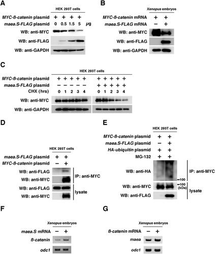 Figure 2. ß-catenin degradation and ubiquitination by Maea.S. Plasmids of the indicated constructs were transfected. Indicated antibodies were used for western blotting (WB) and immunoprecipitation (IP). (a) WB of ectopically expressed Xenopus ß-catenin protein in HEK 293 T cells. Transfected maea.S-FLAG plasmid amounts are indicated (0, 0.5, 1.5, and 5 μg per dish). Anti-GAPDH antibody was used as a loading control. (b) WB of lysates of Xenopus animal cap cells from embryos (st. 9) injected with MYC-ß-catenin mRNA (50 pg/blastomere) or co-injected with maea.S-FLAG mRNA (500 pg/blastomere) into four animal blastomeres of 8-cell embryos. (c) Cycloheximide chase assay. maea.S-FLAG plasmid was transfected at 24 h after MYC-ß-catenin plasmid transfection in HEK 293 T cells. From 5 h after the transfection of maea.S-FLAG plasmid, cells were treated with cycloheximide (CHX) (20 mg/ml) during the indicated hours (h). (d) Interaction between ectopically expressed Xenopus maea.S and ß-catenin in HEK 293 T cells. At 24 h after transfection, immunoprecipitation assay was examined. (e) WB of immunoprecipitates of ubiquitinated ß-catenin protein treated with MG-132 (10 μM, 4 h) 24 h after transfection in HEK293T cells. (f) RT-PCR analysis of the animal caps from embryos injected with maea.S mRNA (1000 pg/blastomere). odc1 expression was used as an internal control. (g) RT-PCR analysis of the animal caps from embryos injected with ß-catenin mRNA (50 pg/blastomere).