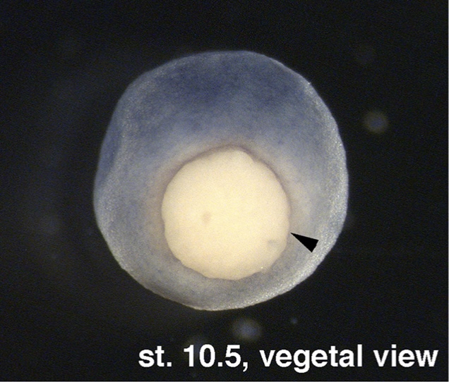 maea (macrophage erythroblast attacher) gene expression in a X. laevis embryo, NF stage 10.5, as assayed via in situ hybridization, vegetal view, dorsal up.