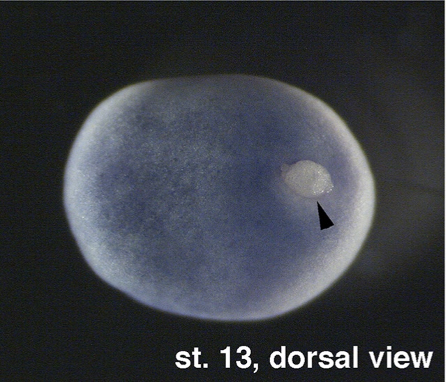 maea (macrophage erythroblast attacher) gene expression in X. laevis embryo, NF stage 13, as assayed via in situ hybridization, dorsal view, anterior left.