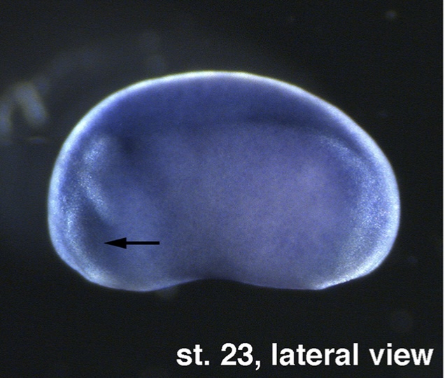 maea (macrophage erythroblast attacher) gene expression in X. ;aevis embryo, NF stage 23, as assayed via insitu hybridization, lateral view, anterior left, dorsal up.