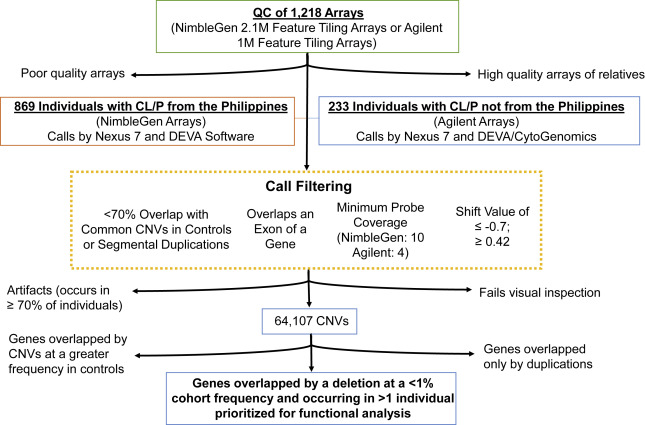 Figure 1. Bioinformatics copy-number-variant prioritization pipeline Of the original 1,218 arrays, 1,102 passed quality controls and were used for downstream analyses. Copy-number variants (CNVs) which were overlapping an exon of a gene which passed minimum quality-control metrics (probe coverage and shift value) but occurring in less than 70% of the cohort or sharing less than 70% overlap with common CNVs or segmental duplications, were visually inspected. Genes that were recurrently deleted but at a frequency of less than 1% of the cohort with CL/P and at a higher frequency in individuals with clefts versus control subjects were prioritized for functional analysis. |