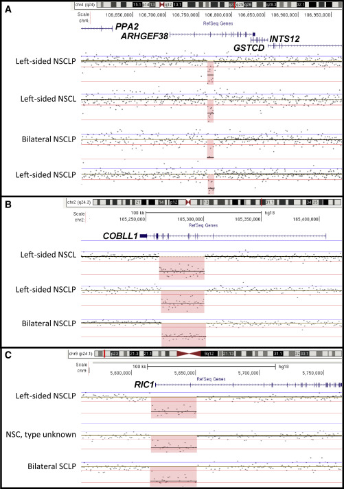 Figure 2. Log2 plots of top candidate clefting genes Log2 plots of (A) ARHGEF38, (B) COBLL1, and (C) RIC1 were generated using BioDiscovery’s Nexus 7 software and the UCSC genome browser. NSCLP, non-syndromic cleft lip and palate; NSCL, non-syndromic cleft lip only; NSC, non-syndromic cleft; SCLP, syndromic cleft lip and palate. |