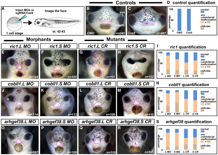 Figure 3. Knockdown of Ric1, Cobll1, and Arhgef38 cause craniofacial malformations in Xenopus laevis (A) Schematic showing injection of reagents at the one-cell stage followed by imaging at stage 42–43 (80–87 hpf). Xenopus illustrations © Natalya Zahn (2022).74 (B and C) Frontal view of the face of representative tadpoles injected with control morpholinos (MOs) or Cas9. (D) Stacked bar graphs showing that 100% of the tadpoles were normal with respect to their craniofacial morphology. (E–H) Frontal views of the faces of representative tadpoles injected with splice-blocking MOs or short guide RNA (sgRNA)/Cas9 targeting ric1.L and ric1.S, respectively (three biological replicates for each). (I) Stacked bar graphs showing the percentage of the tadpoles that had normal faces, had craniofacial malformations, or triangular mouths that appeared cleft-like. (J–M) Frontal views of the faces of representative tadpoles injected with MOs or sgRNA/Cas9 targeting cobll1.L and cobll1.S (two biological replicates for each). (N) Stacked bar graphs showing the percentage of the tadpoles that had normal faces, had craniofacial malformations, or triangular mouths that appeared cleft-like. (O–R) Frontal views of the faces of representative tadpoles injected with MOs or sgRNA/Cas9 targeting arhgef38.L and arhgef38.S (two biological replicates for each). (S) Stacked bar graphs showing the percentage of the tadpoles that had normal faces, had craniofacial malformations, or triangular mouths that appeared cleft-like. The tadpole mouth opening is outlined in pink dots. Numbers of tadpoles are reported in the bottom right corner. CMO, control morpholino; CR, CRISPR-Cas9; st, stage; cg, cement gland; L, Xenopus laevis L homeolog; S, Xenopus laevis S homeolog. |
