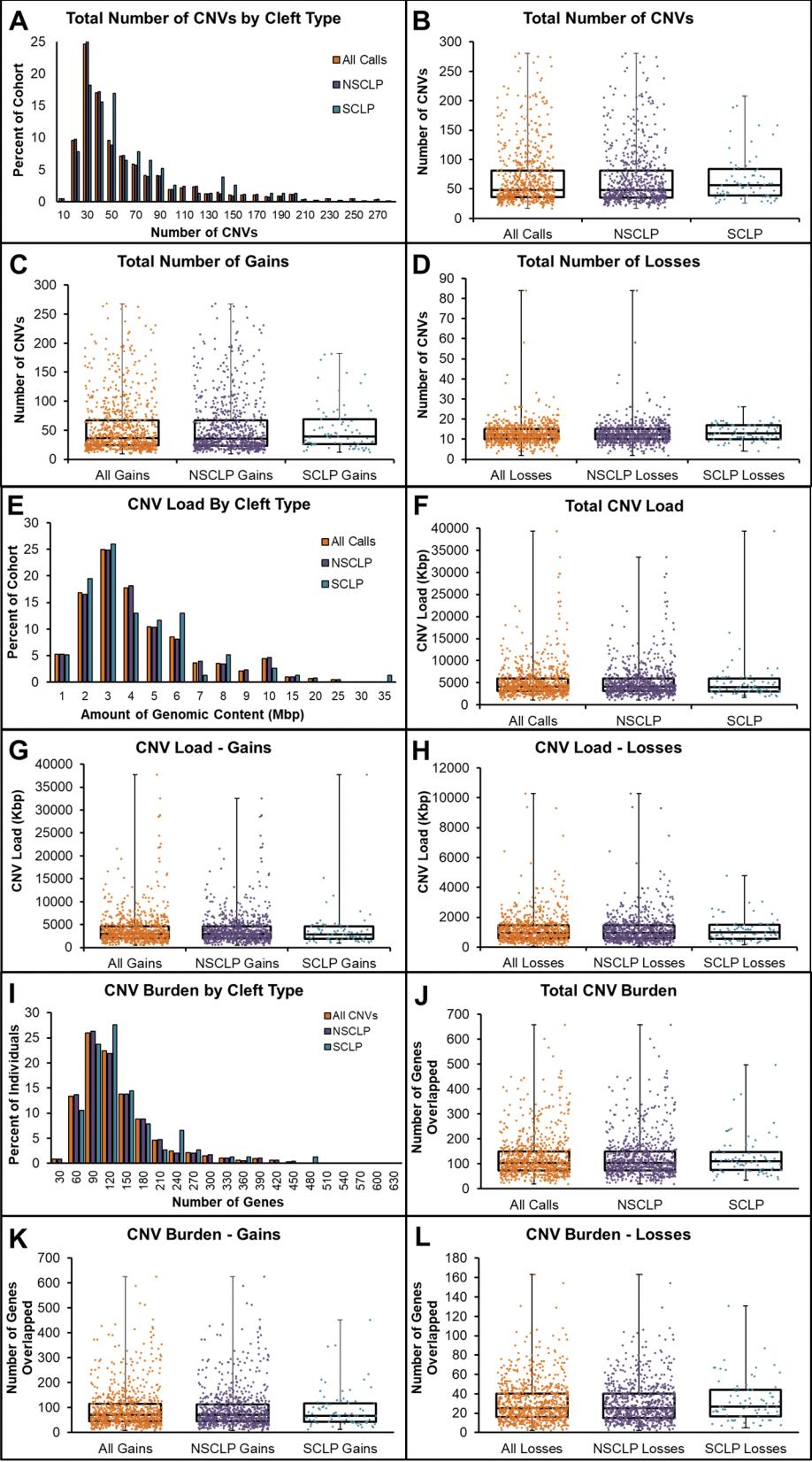 Figure S1: Copy number variant profiles detected in individuals from the Philippines by cleft type. The total number of copy number variants (CNVs; A-D), total amount of genomic content overlapped by CNVs (“CNV load”; E-H), and total amount of coding genomic content overlapped by CNVs (“CNV burden”; I-L), detected within the cohort from the Philippines were compared between clefting category [All; NSCLP, non-syndromic cleft lip and/or cleft palate; SCLP, syndromic cleft lip and/or cleft palate] and stratified by all calls (A, B; E, F; I, J), gains (C, G, K), or losses (D, H, L), respectively. No significant differences between cleft type and CNV profile were observed using a 2-sided Wilcoxon Rank Sum test and after correcting for multiple comparisons (27; comparisons for CNVs occurring at a 1-5% frequency and <1% frequency not shown) using Bonferroni (pvalue threshold for significance: <0.00185). Calculated p-values for each comparison shown are as follows: Total Number of CNVs (B) = 0.5093; Total Number of Gains (C) = 0.3898; Total Number of Losses (D) = 0.1141; Total CNV Load (F) = 0.4473; CNV Load Gains (G) = 0.4902; CNV Load Losses (H) = 0.8966; Total CNV Burden (J) = 0.3080; CNV Burden Gains (K) = 0.3077; CNV Burden Losses (L) = 0.7188. |