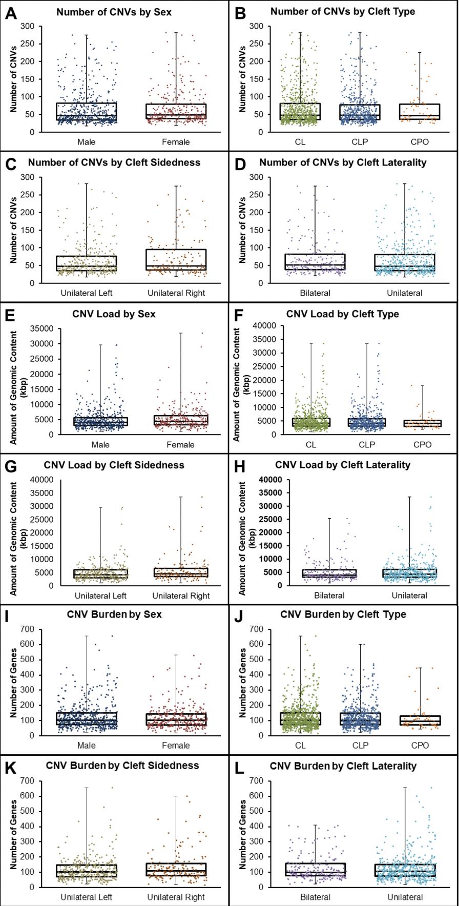 Figure S2: Sub-stratification of copy number variants within individuals with NSCL/P from the Philippines. The total number of copy number variants (CNVs; A-D), total amount of genomic content overlapped by CNVs (“CNV load”; E-H), and total amount of coding genomic content overlapped by CNVs (“CNV burden”; I-L), detected within individuals with non-syndromic cleft lip and/or cleft palate (NSCL/P) from the Philippines were compared between each individual’s genotypic sex (male, female; A, E, I), cleft type (CL, cleft lip only; CLP, cleft lip and cleft palate; CPO, cleft palate only; B, F, J), unilateral cleft sidedness (left, right; C, G, K), and cleft lip laterality (bilateral, unilateral; D, H, L). No significant differences between clefting category and CNV profile were observed using a 2-sided Mann-Whitney test (sex, sidedness, and laterality) or Kruskal-Wallis test (cleft type) after correcting for multiple comparisons (36; comparisons for gains and losses not shown) using Bonferroni (p-value threshold for significance: <0.00139). Calculated p-values for each comparison shown are as follows: Number of CNVs by Sex (A) = 0.1499; Number of CNVs by Cleft Type (B) = 0.4296; Number of CNVs by Cleft Sidedness (C) = 0.1389; Number of CNVs by Cleft Laterality (D) = 0.2301; CNV Load by Sex (E) = 0.0316; CNV Load by Cleft Type (F) = 0.4382; CNV Load by Cleft Sidedness (G) = 0.0455; CNV Load by Cleft Laterality (H) = 0.4902; CNV Burden by Sex (I) = 0.5619; CNV Burden by Cleft Type (J) = 0.4449; CNV Burden by Cleft Sidedness (K) = 0.1052; CNV Burden by Cleft Laterality (L) = 0.4902. |