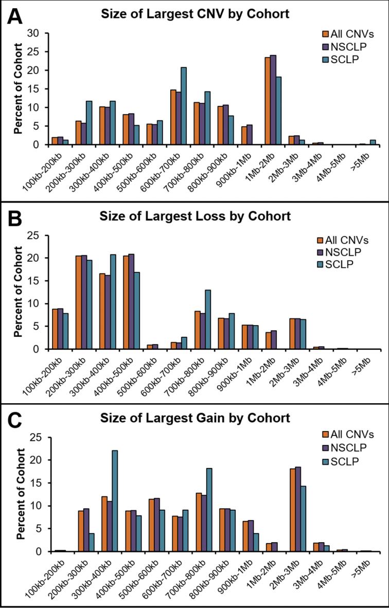 Figure S3: Assessment of the largest copy number variants occurring within each individual by cleft type. The largest CNV within each individual in the study was binned by size and compared as a percent of the total cohort (All CNVs), or NSCLP and SCLP subgroups harboring a similarly sized CNV across any CNV type (A), losses (B), or gains (C). NSCLP, non-syndromic cleft lip and/or cleft palate; SCLP, syndromic cleft lip and/or cleft palate; kb, kilobase; Mb, megabase. |