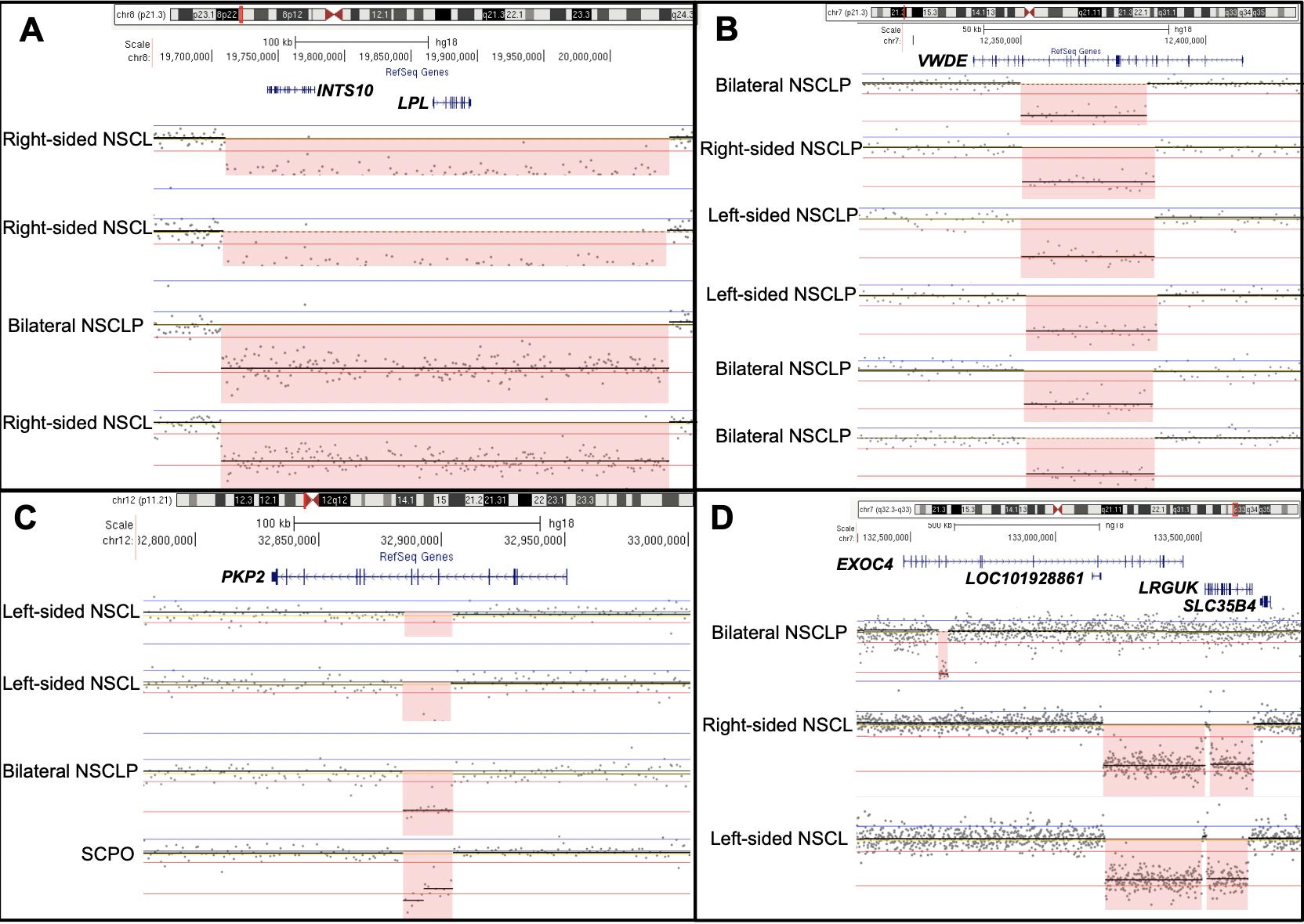 Figure S4: Log2 plots of four candidate clefting genes with strong likelihood of involvement in craniofacial development which were not prioritized for functional analysis. Log2 plots of (A) LPL, (B) VWDE, (C) PKP2, and (D) EXOC4 were generated using BioDiscovery’s Nexus 7 software and the UCSC genome browser. NSCLP, non-syndromic cleft lip and palate; NSCL, non-syndromic cleft lip only; SCPO, syndromic cleft palate only. |