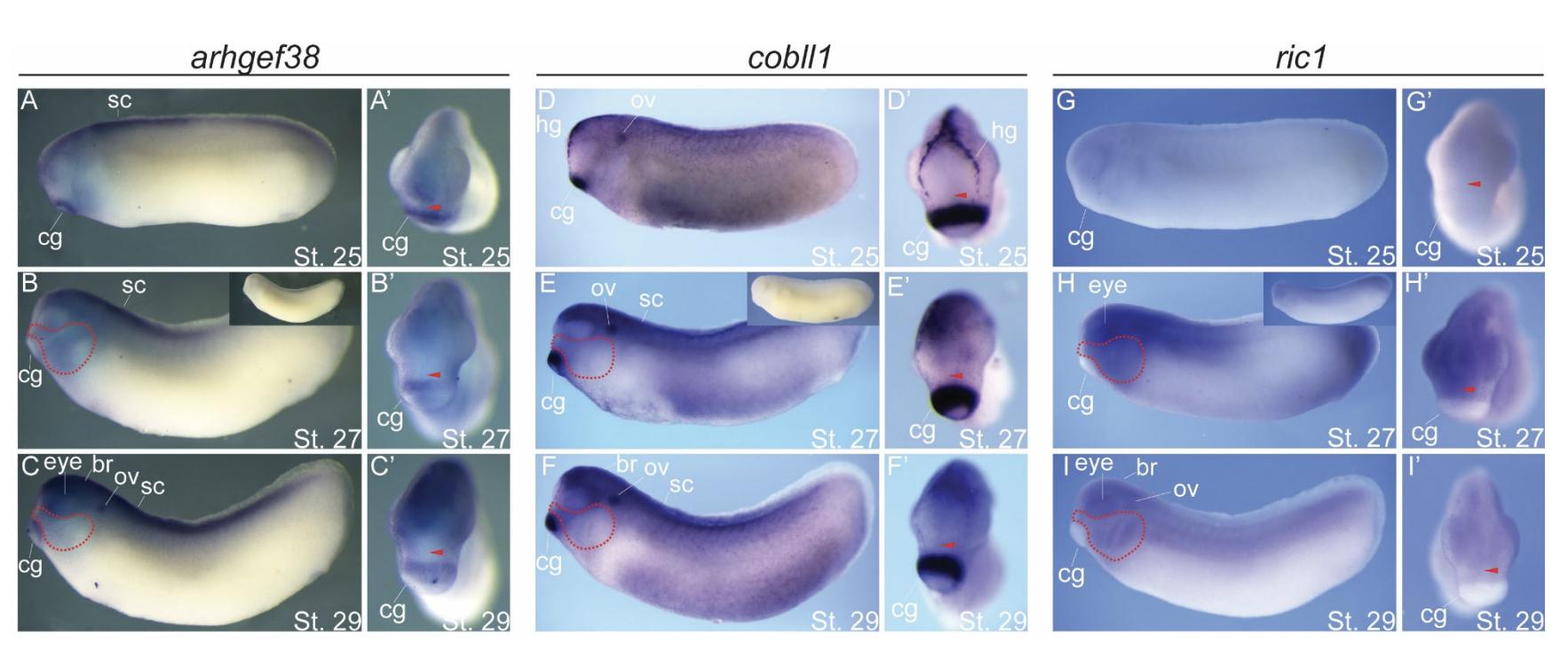 Figure S5: In situ hybridization of arhgef38, cobll1, and ric1 in Xenopus laevis. (A-C) Stages 25-29 lateral view, showing expression of arhgef38 throughout the head, with expression overlapping the region that includes the branchial arches shown by the red dotted lines in panels B and C. Sense shown as an inset in panel B. (D-F) Stages 25-29 lateral view, showing expression of cobll1 in craniofacial tissue, hatching gland, and cement gland. Expression overlapping the region that includes the branchial arches is indicated by the red dotted lines in panels E and F. Sense shown as an inset in panel E. (G-I) Stages 25-29 lateral view, showing expression of ric1 throughout the head, with expression overlapping the region that includes the branchial arches shown in red dotted lines in panels H and I. Sense shown as an inset in panel H. (A’-I’) Anterior view at stages 25-29 for each gene’s probe. Red arrows indicate the location of future mouth development. The brightness and contrast of these images have been adjusted to optimize the visualization of each probe. br, brain; cg, cement gland; hg, hatching gland; ov, otic vesicle; sc spinal cord; st, stage. |