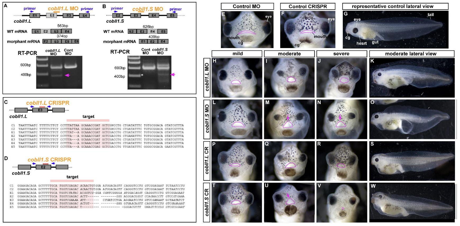 Figure S7: Knockdown of cobll1 in Xenopus laevis. (A, B) Verification of cobll1 splice-blocking morpholinos. Shows schematic of the gene structure showing where the morpholino (MO) targets (orange) and the predicted exon deletion. Blue arrows represent the primers used to detect changes in the resulting mRNA. RT-PCR results shows alternative size product consistent with the predicted deletion (pink arrow). (C, D) Verification of cobll1 CRISPR/Cas9 mutagenesis. Shows schematic of the gene structure and sgRNA target (red). Blue arrows represent the primers used to sequence the gene and detect mutations. Sequencing is shown for two controls (“C1”, “C2”) and five candidate mutants (“E1-E5”) with craniofacial malformations. The red shaded region is the sequence targeted by the sgRNA. (E-W) Frontal and lateral views of representative tadpoles injected with MOs or sgRNA/Cas9 targeting cobll1.L and cobll1.S demonstrates the similar range of malformations as well the similarity of morphants and mutants. The mouth opening is outlined in pink dots. Pink arrows indicate a triangular shaped mouth. bp, base pair; cg, cement gland; cont, control; MO, morpholino; sgRNA, short guide RNA; WT, wildtype. |