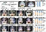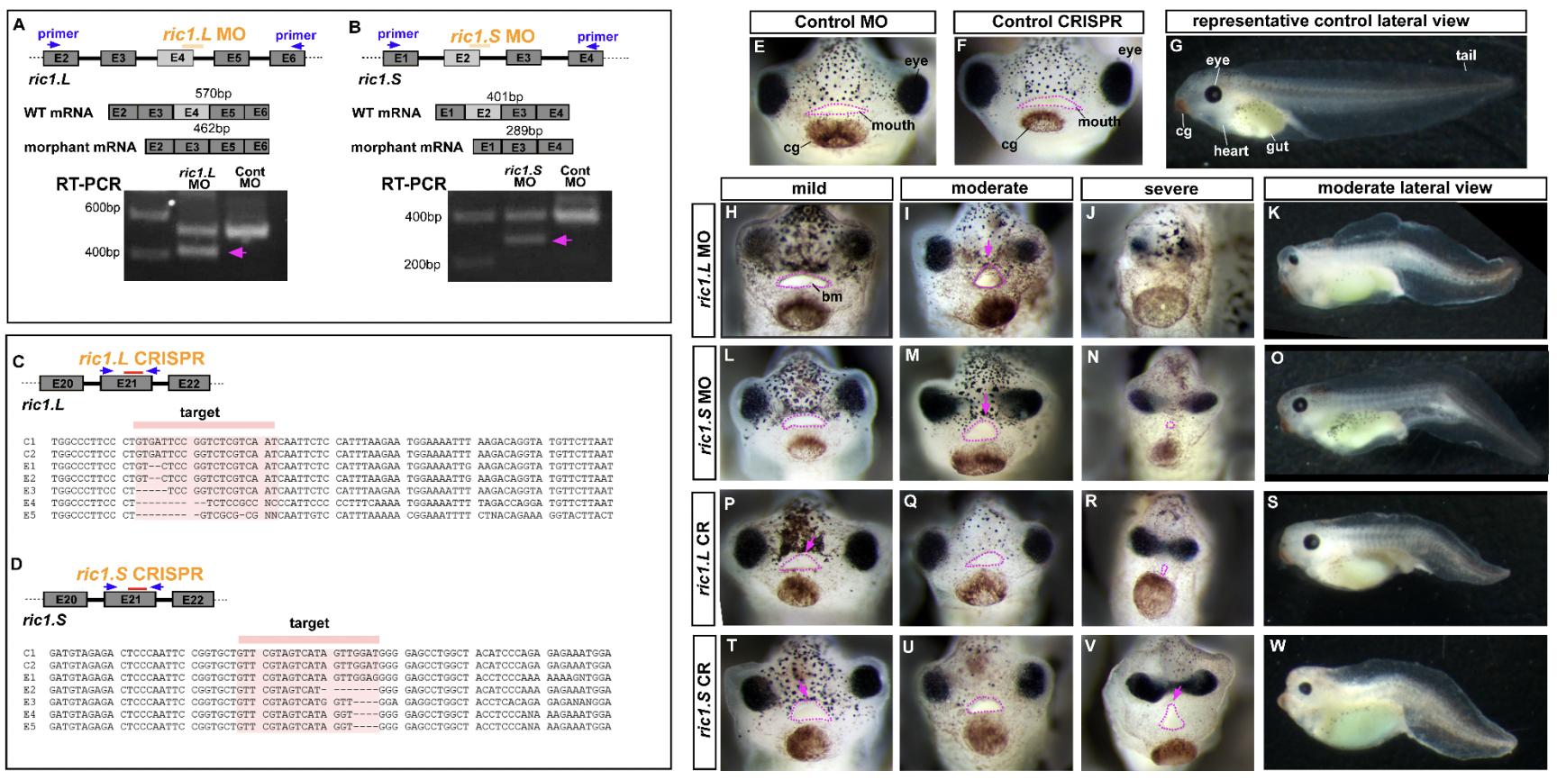Figure S8: Knockdown of ric1 in Xenopus laevis. (A, B) Verification of ric1 splice-blocking morpholinos. Shows schematic of the gene structure showing where the morpholino (MO) targets (orange) and the predicted exon deletion. Blue arrows represent the primers used to detect changes in the resulting mRNA. RT-PCR results shows alternative size product consistent with the predicted deletion (pink arrow). (C,D) Verification of ric1 CRISPR/Cas9 mutagenesis. Shows schematic of the gene structure and sgRNA target (red). Blue arrows represent the primers used to sequence the gene and detect mutations. Sequencing is shown for two controls (“C1”, “C2”) and five candidate mutants (“E1-E5”) with craniofacial malformations. The red shaded region is the sequence targeted by sgRNA. (E-W) Frontal and lateral views of representative tadpoles injected with MOs or sgRNA/Cas9 targeting ric1.L and ric1.S demonstrates the similar range of malformations as well the similarity of morphants and mutants. The mouth opening is outlined in pink dots. Pink arrows indicate a triangular shaped mouth. bm, buccopharyngeal membrane; bp, base pair; cg, cement gland; cont, control; MO, morpholino; sgRNA, short guide RNA; WT, wildtype. |