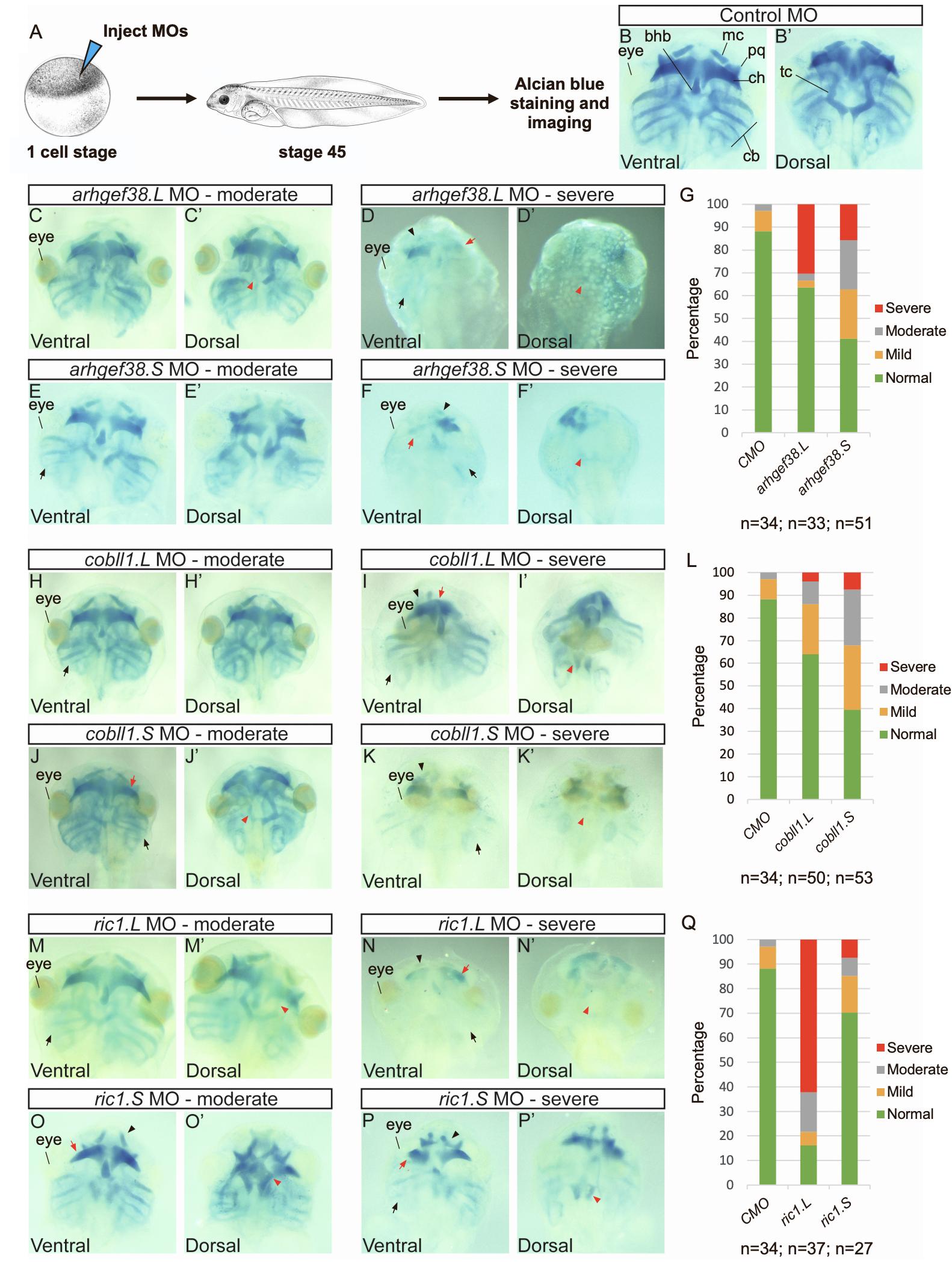 Figure S9: Alcian blue staining of craniofacial cartilage from arhgef38, cobll1, and ric1 splice-blocking morpholino knockdowns in Xenopus laevis tadpoles. (A) Schematic depicting the injection of splice-blocking morpholinos (MOs) at the one-cell stage followed by aging to stage 45 (98-106 hours post fertilization) and Alcian blue staining. Xenopus illustrations © Natalya Zahn (2022).150 (B, B’) Ventral and dorsal views of the craniofacial cartilage of a representative tadpole injected with a control morpholino (CMO). (C-D’) Ventral and dorsal views of the craniofacial cartilage of representative tadpoles injected with a splice-blocking MO targeting arhgef38.L that developed moderate (C, C’) or severe (D, D’) phenotypes. (E-F’) Ventral and dorsal views of the craniofacial cartilage of representative tadpoles injected with a splice-blocking MO targeting arhgef38.S that developed moderate (E, E’) or severe (F, F’) phenotypes. (G) Stacked bar graph showing percentage of tadpoles with normal faces, mild cartilage phenotypes (one cartilage structure affected), moderate cartilage phenotypes (multiple cartilage structures affected), or severe cartilage phenotypes (near absence or major disfiguration of the cartilage structures). (H-I’) Ventral and dorsal views of the craniofacial cartilage of representative tadpoles injected with a splice-blocking MO targeting cobll1.L that developed moderate (H, H’) or severe (I, I’) phenotypes. (J-K’) Ventral and dorsal views of the craniofacial cartilage of representative tadpoles injected with a splice-blocking MO targeting cobll1.S that developed moderate (J, J’) or severe (K, K’) phenotypes. (L) Stacked bar graph showing percentage of tadpoles with normal faces, mild cartilage phenotypes, moderate cartilage phenotypes, or severe cartilage phenotypes. (M-N’) Ventral and dorsal views of the craniofacial cartilage of representative tadpoles injected with a splice-blocking MO targeting ric1.L that developed moderate (M, M’) or severe (N, N’) phenotypes. (O-P’) Ventral and dorsal views of the craniofacial cartilage of representative tadpoles injected with a splice-blocking MO targeting ric1.S that developed moderate (O, O’) or severe (P, P’) phenotypes. (Q) Stacked bar graph showing percentage of tadpoles with normal faces, mild cartilage phenotypes, moderate cartilage phenotypes, or severe cartilage phenotypes. Red arrowhead indicates a defect in trabecular cartilage (tc), red arrow indicates a defect in ceratohyal cartilage (ch), black arrowhead indicates a defect in Meckel’s cartilage (mc), black arrow indicates a defect in ceratobranchial cartilage (cb). bhb, basihyobranchial cartilage; pq, palatoquadrate cartilage. |