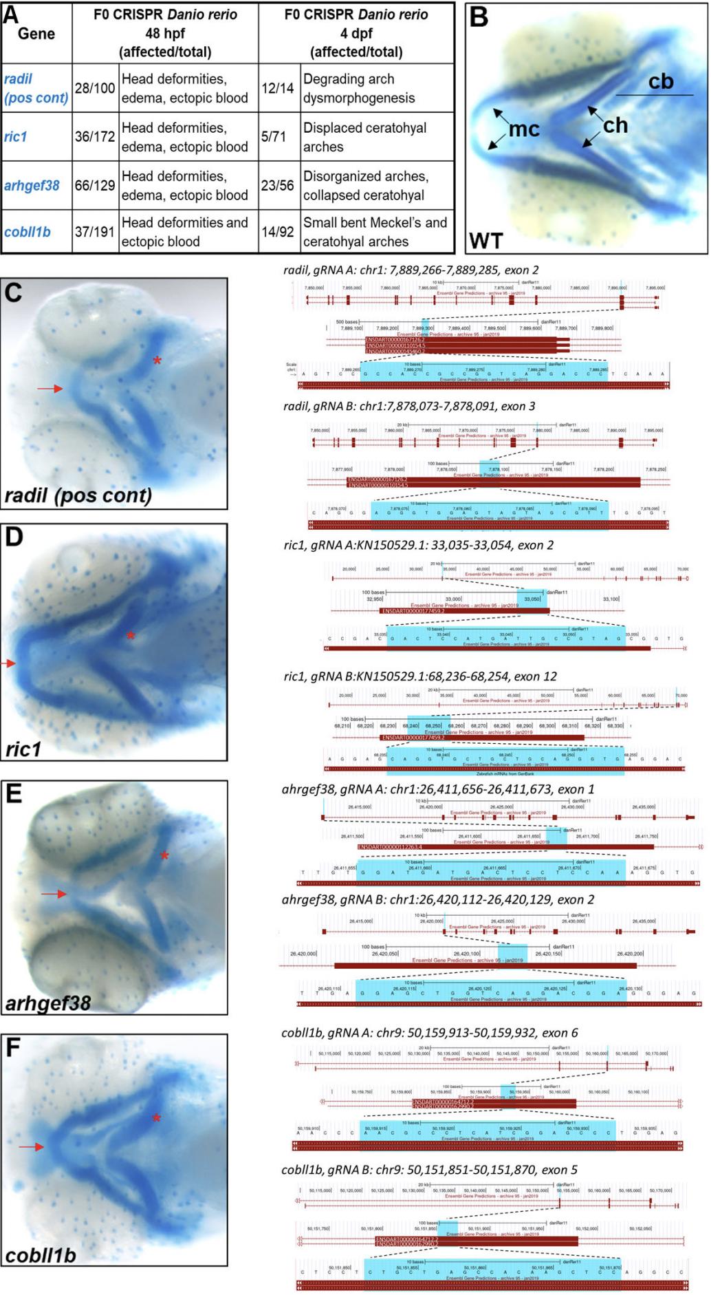 Figure S10: Abnormal development of the craniofacial skeleton in F0 Danio rerio larvae after targeting ric1, arhgef38, and cobll1a with CRISPR. (A) Table showing genes of interest and summary of phenotypes in Danio rerio injected at single cell stage with CRISPR/Cas9 reagents targeting the indicated gene. Resulting abnormalities were quantified at 48 hours post fertilization (hpf) and four days post fertilization (dpf). All three candidate genes showed head deformities similar to a positive control (radil). (B-F) Ventral views, anterior to the left, of larvae fixed at four dpf and processed with alcian blue. Figure B was adapted from Albertson and Yelick, 2004 showing an uninjected larva (WT, wildtype). (C-F) larvae injected with Cas9 protein and sgRNAs targeting the indicated genes, with the two targeted regions shown to the right of each skeletal image and highlighted in blue (listed as sgRNA A and sgRNA B). Meckel’s cartilage (mc; red arrow) is hypoplastic in all the F0 mutants, and dysmorphogenesis of the ceratohyal arch (red asterisk) was commonly accompanied by the loss or reduction of the ceratobranchial arches. ch, ceratohyal arch; cb, ceratobranchial arches; gRNA, short guide RNA; pos cont, positive control. |