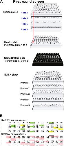 Fig. 2. Primary screening method. (A) Diagram representing the strategy used to rapidly identify wells producing antibodies to multiple targets at once. Four plates per fusion were used. Thirty microlitres were taken from each well and placed in the master plate (total volume 120 µl). The master plate was diluted with 200 µl of TBST (TBS with 0.1% Tween 20). From the 320 µl of the master plate, 50 µl was added to each of the five ELISA plates plus the glass-bottom plate containing XTC cells transfected with each of the five targets. Simultaneously, 50 µl of supernatant was added to each well of five ELISA plates, each coated with individual proteins. Wells positive in either or both assays (A1 to H12) were then tested on each of the original plates (blue) to identify the plate number (deconvolution, 1A1 to 4H12). (B) Primary screen by ELISA using the cytoplasmic domain of Adam13/33 expressed in Hek293T cells (top) and his-tag bacterial fusion protein (bottom). The mice were immunized using the bacterial fusion protein. Highlighted wells are above the chosen background (0.2 for Hek293T and 0.5 for bacterial fusion protein). Wells highlighted in green are common to both ELISA and were selected for further screening.