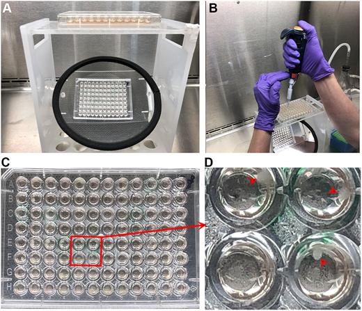 Fig. 3. Manual clone picking. (A) Plates containing the hybridoma fusion were placed on a mirror to visualize large colonies. (B) Investigator pipetting a single colony guided by the mirror. (C) Photographs of the plate as seen in the mirror. (D) Higher magnification of four wells. Individual colonies are highlighted with red arrowheads.