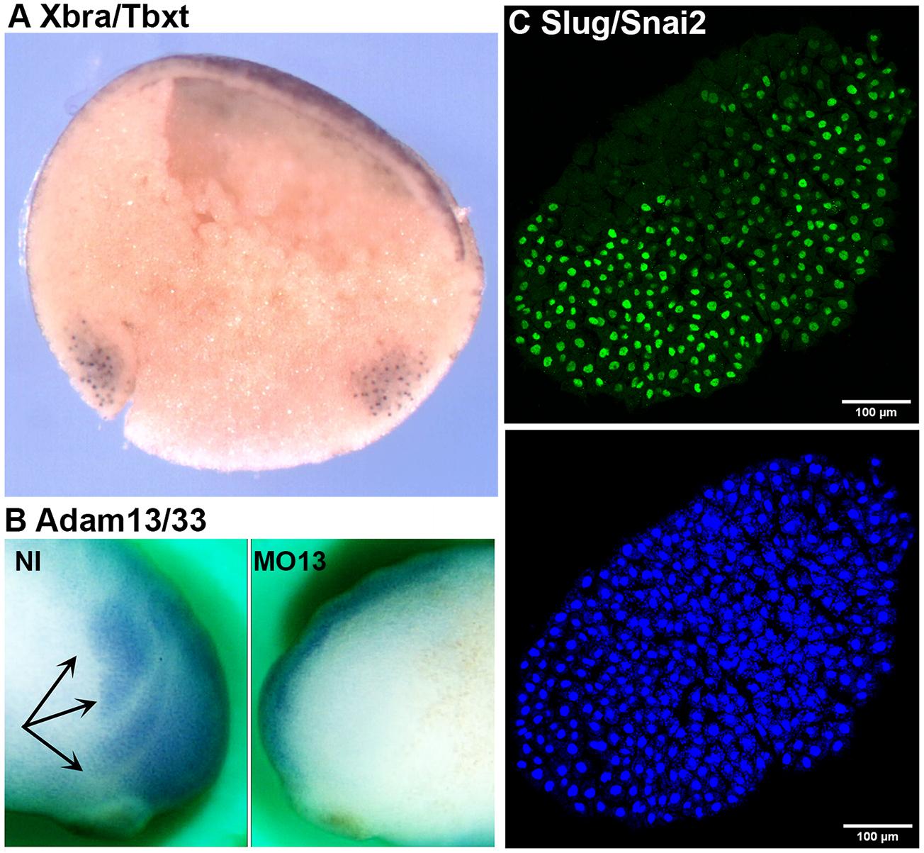 Fig. 5. Immunostaining. (A) Whole-mount immunostaining using DA12H2xbra on bisected gastrula (Xbra/Tbxt). The dorsal side is to the left, and the animal pole is up. The antibody stains the nuclei in both the dorsal and ventral marginal zones (mesoderm). (B) Whole-mount immunostaining using a monoclonal antibody to Adam13/33 (DA8E6adam13) on embryos injected at the two-cell stage with a morpholino that blocks translation of Adam13. The cranial neural crest cells (black arrows) are visible on the non-injected (NI) side, but are absent on the injected side (MO13). (C) Immunofluorescence of a cranial neural crest explant using mAb DA1A8slug (green) and counterstained with DAPI (blue). Note that most of the nuclei are stained for Slug/Snai2 except for a small section on the left of the explant (dorsal) that is likely to be composed of neural plate cells.