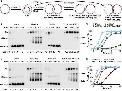 (A) Plasmid DNA was replicated using Xenopus egg extracts in the presence of [α-32P]dATP to label newly synthesized DNA strands under mock-depleted and ΔTOP2α-depleted conditions. The expected DNA structures, identified in Dewar et al.38 and Heintzman et al.,15 are indicated.