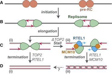 (D) (i) The final products of replication termination are normally fully replicated and unlinked. (ii) If forks stall due to lack of TOP2 activity (Figure 6Cii), these products contain DNA catenanes. The fate of these structures and whether catenanes can be removed independently of TOP2 is unclear.