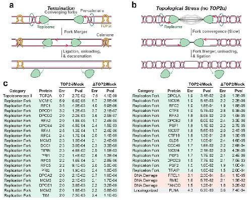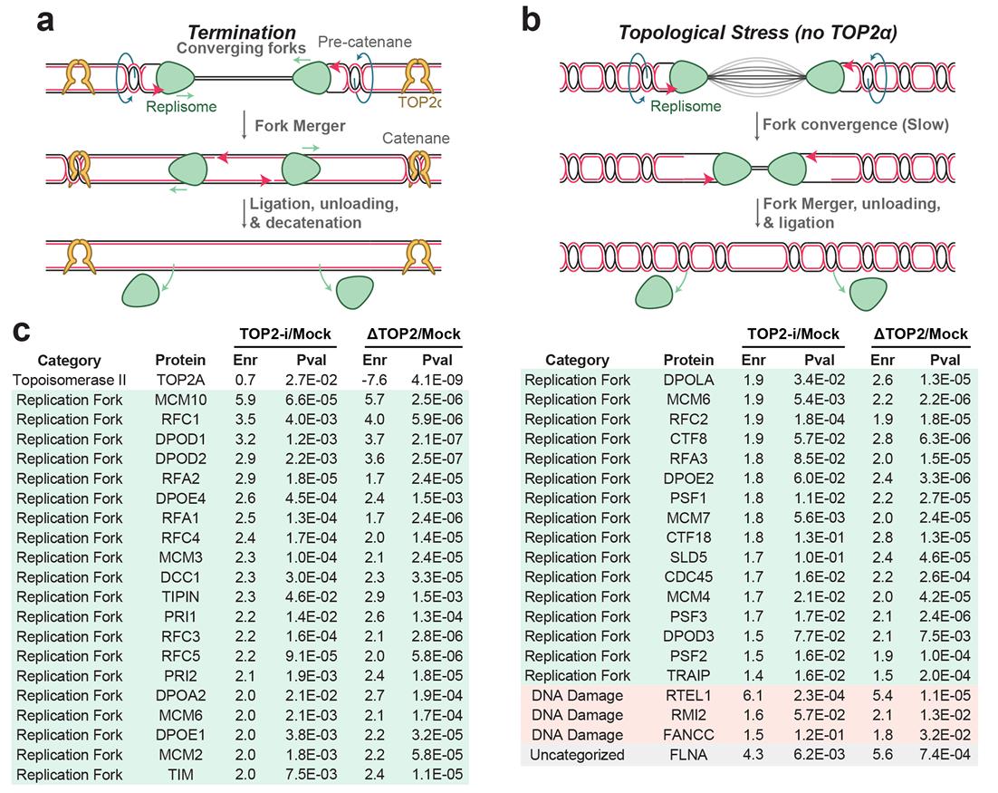 Supplemental Figure 1: Effects of topological stress on replication termination, related to Figure 1. (A) Model for vertebrate replication under normal conditions [S1]. Termination occurs when two converging replication forks encounter each other upon the same stretch of DNA (‘fork convergence’). Replisomes move past each other to unwind any remaining duplex (‘fork merger’) because the replicative helicases encircle opposite DNA strands. After forks merge, replisomes pass over fully replicated DNA from the opposing fork which allows any remaining daughter strand gaps to be rapidly filled in and ligated (‘ligation’). Replisomes are also removed by an active unloading pathway (‘unloading’) [S1-4]. Pre-catenanes are formed throughout replication and resolved by Topoisomerase IIα (TOP2α). After fork merger, any pre-catenanes that were not resolved during replication form catenanes, which are resolved by TOP2α (‘decatenation’) [S5]. (B) In the absence of (TOP2α) converging replication forks stall during vertebrate replication termination, which delays all downstream termination events [S5]. Replication forks eventually unwind the remaining DNA duplex independent of TOP2α, which allows for fork merger, unloading, and ligation, and decatenation to take place. However, decatenation cannot take place due to the lack of TOP2 activity. (C) Full list of proteins from Figure 1B including their enrichment (Enr) and P-values (Pval) for different comparisons. Enr is a log2 transformation of the mean LFQ value from 3 independent experiments of ΔTOP2α or TOP2-i divided by the mean LFQ value from 3 independent biological replicates of mock. Pval was calculated using a modified t-test in ProStar performed with BenjaminiHochberg correction for multiple comparisons. See also Supplemental tables S1 and S2.