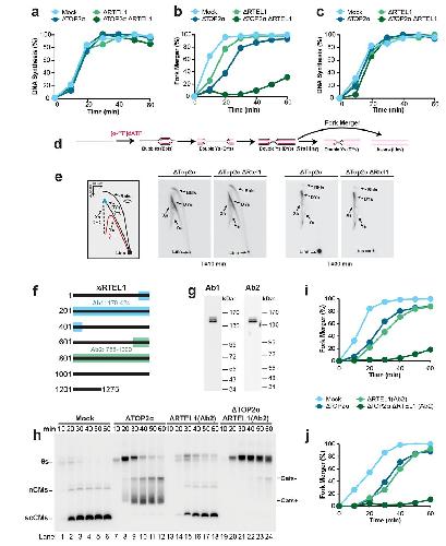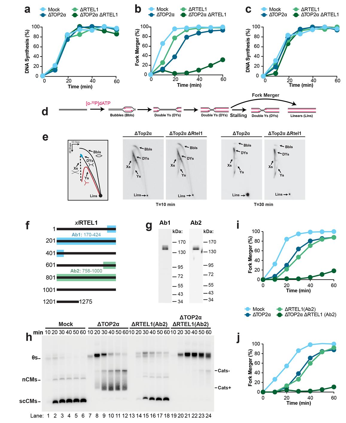 Supplemental Figure 2: Contribution of RTEL1 to fork merger, related to Figure 2. (A) Quantification of total DNA synthesis from Figure 2B. (B) A biological replicate of Figure 2C. (C) An biological replicate of (A). (D) To directly analyze the DNA structures formed during replication in TOP2α- and TOP2αRTEL1-depleted extracts, DNA replication was performed as in Figure 2B-C then DNA was purified and restriction digested to yield DNA structures that could be identified by 2-D gel electrophoresis. The typical DNAstructures are indicated. Note that initiation results in the formation of bubbles, which are then converted to double-Ys once one of the two replication forks moves beyond the restriction enzyme site within the plasmid template. (E) 2-D gel electrophoresis was performed to analyze DNA structures from (D). A representative experiment of two biological replicates is shown. The schematic indicates the expected 2-D gel electrophoresis migration patterns. Ys arise when one of the two replication forks are broken while the sources of Xs is unclear. Double-Ys, Bubbles, Ys, and Xs were all previously found to persist following inactivation of TOP2α [S5]. At 10 minutes the relative abundance of replication intermediates was essentially indistinguishable between TOP2α- and TOP2α-RTEL1-depleted extracts, indicating that RTEL1 did not detectably impact early stages of DNA replication. At 30 minutes large Double-Ys and Bubbles were readily detectable, as expected for termination defects, in addition to the Xs and Ys previously described [S5]. The linear products of replication (Lins) were reduced in TOP2α-RTEL1-depleted extracts, consistent with defective fork merger. Importantly the pattern of replication intermediates was essentially indistinguishable in TOP2α- and TOP2α-RTEL1-depleted extracts. These results demonstrate that the same DNA structures form in both TOP2α- and TOP2α-RTEL1-depleted extracts but in TOP2α-RTEL1-depleted extracts conversion of these structures to the linear products of fork merger is delayed. (F) Schematic of the amino acid sequence of Xenopus laevis RTEL1 (xlRTEL1). An antigen fragment corresponding to amino acids 170-424 was previously used to raise an antibody against xlRTEL1 (‘Ab1’) [S6], which was used in Figure 2B-C. An antigen fragment corresponding to amino acids 758-1000 was used to raise a separate antibody against xlRTEL1 in this study (‘Ab2’). (G) Western blotting of Xenopus egg extracts was performed to evaluate the specificity of the two xlRTEL1 antibodies from (F). Each antibody detected the three isoforms of xlRTEL1 (described in [S6]) but no other major bands, which demonstrated a high level of specificity. A representative experiment of two biological replicates is shown. (H) Figure 2B was repeated using Ab2 from (F)-(G). Samples were separated on a native agarose gel and visualized by autoradiography. (I) Quantification of fork merger from (H). As observed in Figure 2C, loss of either RTEL1 or TOP2α delays fork merger, while loss of both largely blocks fork merger. (J) A biological replicate of (I).