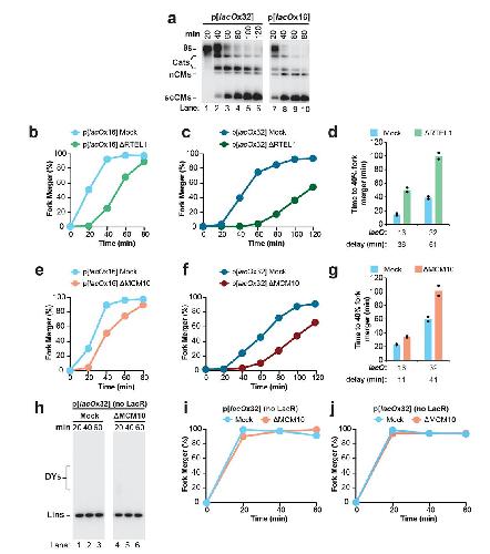 (F) p[lacOx16] was replicated as indicated in (A) using mock-depleted (Mock) and MCM10-depleted (ΔMCM10) extracts. Samples were separated on a native agarose gel and visualized by autoradiography.