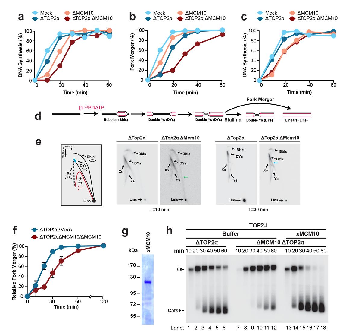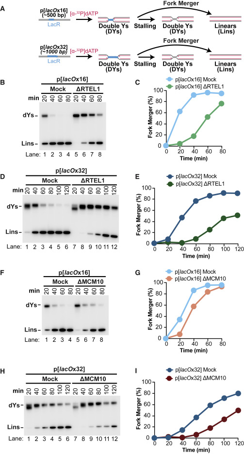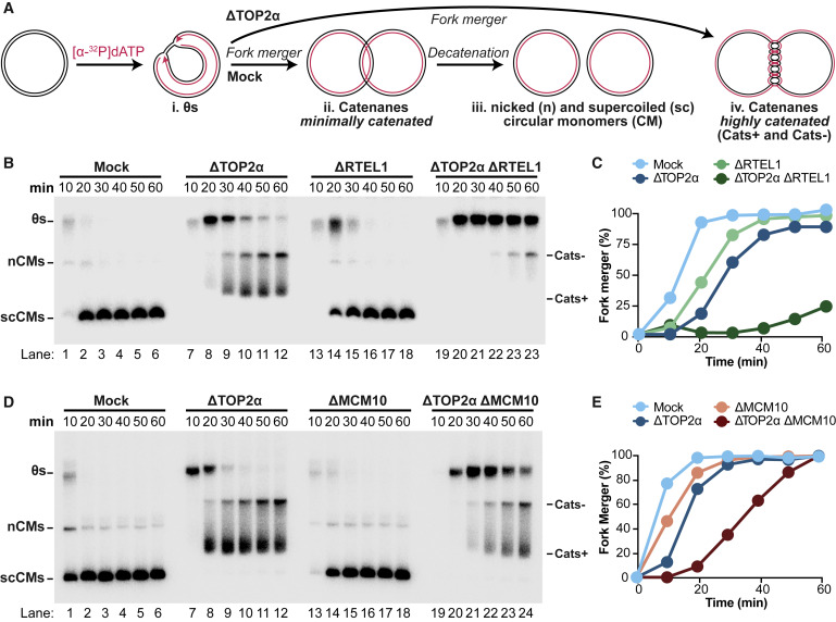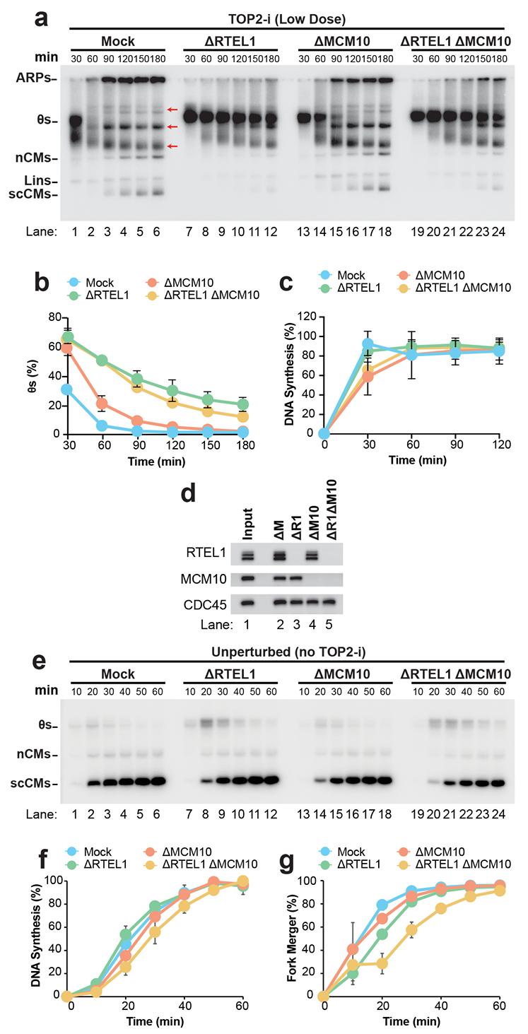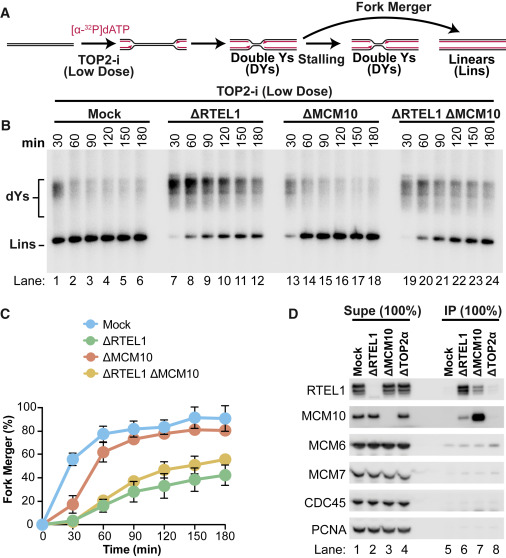 (A) Plasmid DNA was replicated in the presence of a low concentration of TOP2-i using extracts that were mock-depleted (mock) or depleted of RTEL1 (ΔRTEL1), MCM10 (ΔMCM10), or both (ΔRTEL1 ΔMCM10). Plasmids were purified and digested with XmnI, which cuts the plasmid once and allows unambiguous identification of replication fork structures (“DYs”) and fully replicated molecules (“Lins”) so that fork merger can be measured.